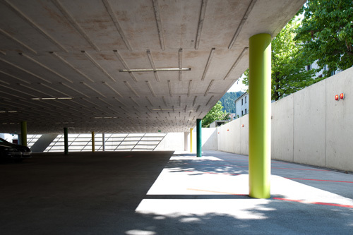 Die auffällige Form gibt dem Gebäude Präsenz im Wirrwarr der frequentierten Vorstadtstraße. Köberl stellt sie in Bezug zu anderen markanten Baulichkeiten in der weiteren Umgebung, wie der weithin sichtbaren Allerheiligenkirche von Clemens Holzmeister, Josef Lackners Schule am Fürstenweg oder dem ehemaligen Pulverturm, der in Verlängerung der Achse des Mitterweg beim Flughafen liegt. Die sichtbare Gebäudehülle ist ein durchlässiger Filter, der das eigentliche – verglaste – Gebäude umhüllt.