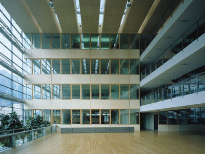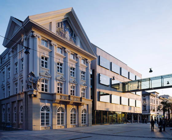 Eine Mauer umringt das Grundstück und verortet die Bank fest am Boden, gibt Sicherheit, integriert die Tiefgaragenabfahrt und schafft einen geschützten Hof und eine kleine Terrasse Richtung Innenstadt. Fächerahorne, wilder Wein und Sumpfgräser im Hof und auf der Terrasse betonen auch im Inneren die Oasensituation in dieser Gegend, kontrastieren den strengen Raster der Fassade und sind außerdem integraler Bestandteil der notwendigen Filterung und Abflussverzögerung der Oberflächenentwässerung – welche durch das völlig überbaute kleine Grundstück eben quasi im Bau zu leisten ist.