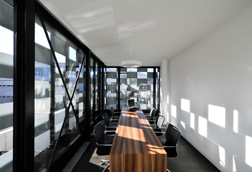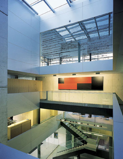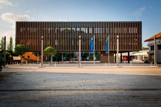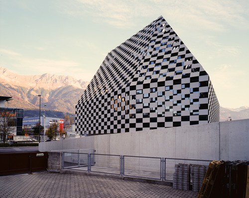 Ganz im Gegensatz zur schweren Betonmauer am Boden, steht die leichte Hülle. Auf Aluschwertern befestigte, glasfaserbewehrte 15 mm starke Betonplatten bilden ein zartes, leichtes, schachbrettartiges Muster vor der eigentlichen Glasfassade. Von Außen entsteht so Leichtigkeit in unterschiedlichen Lichtstimmungen, von Innen ein gepixeltes Bild der unattraktiven Umgebung sowie ein angenehmer Schutz gegen Einblicke. Ein „Schleier“, der auch als Bild des durchaus nicht nur sicheren, sondern auch fragilen „Bankwesens“, des Schachspiels mit seinem notwendigen Vorausdenken oder der Zielflagge für den Sieger beim Formel 1 Rennen wahrgenommen werden kann. Zum Erstellen dieser Hülle, war eine handwerkliche Präzision erforderlich, die nicht den kleinsten Fehler duldete, auch das vielleicht nicht unpassend im Bezug auf die Arbeit im Inneren. (Text: Rainer Köberl)