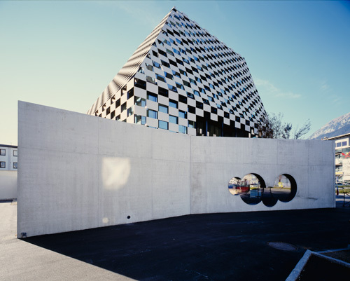 Das Erreichen einer gewissen Höhe erschien dazu notwendig. So entwickelten wir aus den gesetzlich vorgeschriebenen Abständen zu den Nachbargrundstücken diese eigenwillige Form, die damit zwar nicht direkt, jedoch spürbar, Beziehung zu anderen Sonderbauformen in der Gegend – dem Pulverturm, der von weiten sichtbaren Allerheiligenkirche, der Ursulinenschule und dem MPREIS aufnimmt und markant fast unvergesslich, den Beginn dieses Stadtteils markiert.