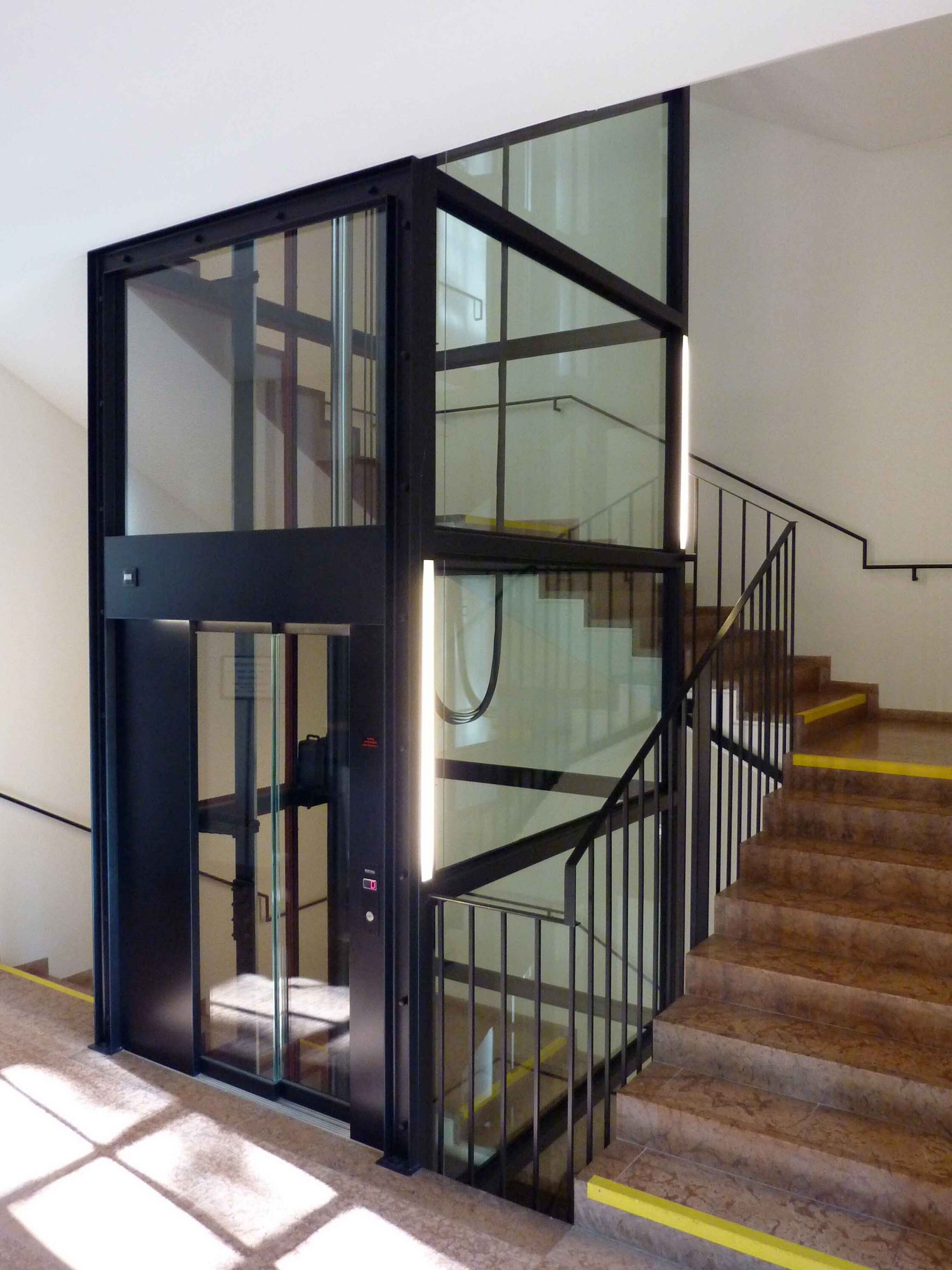 1981 eingebautes Stiegenhaus (durch Architekt Koloman Lenk) + 2008 ergänzter Lift (durch Architekt Matthias Mulitzer)