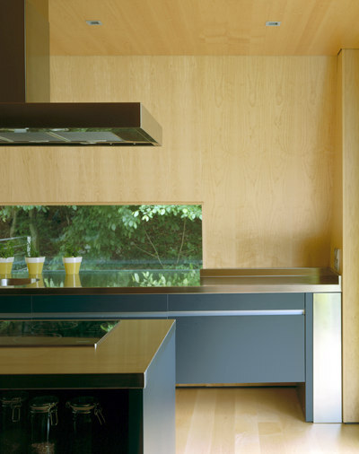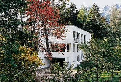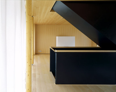 Eine einzige Stütze hält die Wohnbrücke, die mit verschieden großen, im NW ums Eck geführten, überdachten Balkonen und zarter Metallbrüstung neugierige Fühler zu Frischluft und Natur ausstreckt. Schwarze Untersichten rhythmisieren die Fassade, darunter fließt die Geländemulde im eigens angelegten Teich aus. Hier spielen die Kinder mit Freunden, durch den zweiseitig verglasten Vorraum tritt man ein. Wie eine Skulptur führt die einläufige, geschlossene Stahltreppe in den riesigen, oberen Einraum. Der Bauherr verkleidete Wand, Boden und Decke komplett mit hellem, furniertem Ahorn, was den bergenden Charakter einer Schatulle schafft. Durch ein Glasfenster im Boden überblickt man die Tür. Das schalldichte Toilettenahornmöbel scheint aus dem Boden gewachsen, es bildet die Zäsur zwischen Tisch und frei stehendem Herd. Am großen Nordwestbalkon mit Abendsonne davor kann man im Freien essen, die Küchenzeile nistet am tiefen Schrägfenster mit Beleuchtung, Ablage und Waldpanorama. Hier sind Rehe zu erspähen, als zweite Zäsur zum Wohnen im Westen wirkt die Treppe. Mit dreiseitig umlaufender Balkonlandschaft ufert das raumhoch verglaste Innere üppig in die Natur aus. Als große Terrasse setzt sie im SW am Geländerücken auf, als auskragender Balkon dockt sie am Osthang an. Der Bauherr deckte sie mit fein strukturiertem, robustem, dunklem Bankaré- Holz.Ein langer Balkon zieht sich bis ums Osteck die Südfront vor der zweiten, oberen Wohnebene entlang, der Raumstreifen dahinter kann durch Schiebetüren frei fließen. Die Kinderzimmer teilen sich die Westseite – das nördliche hat Übereck-Terrasse mit Untersbergblick, das südliche genießt die Waldmulde. Beide öffnen sich zur großen Spielfläche an der Stiege vor ihrer gelben Badbox. Das Reich der Eltern beginnt beim großen Schrankraum im Osten. Vom Schlafraum im Süden sehen sie auf die Talmulde, von der Wanne vorm roten Schrägfenster in den Wald.
