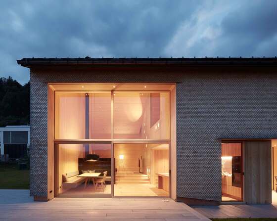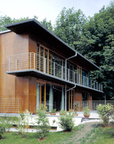 Souverän reagierten die Architekten Christine und Horst Lechner auf die besondere Umgebung. Wie eine Brücke schwebt der Wohnriegel mit der schönen rostbraunen Fassade aus furnierten, geharzten Papierverbundstoffplatten über die Landschaft. Scheu scheint sein schräges Ende dem östlichen Waldsaum zu weichen, innen meint man, in Bäumen zu sitzen. Als Brückenkopf ist das Erdgeschoss teils in die Böschung gegraben, über ein Glasband haben Keller und Gästebad Licht. Transparent öffnet sich der Sockel zur Zufahrt im Osten, die hellen Räume mit Auslauf aufs freifließende Gelände nutzen die Kinder exzessiv. Kontrollierte Wohnraumlüftung mit Wärmetauscher und fußbodenbeheizte Nassräume schaffen ein sehr angenehmes Raumklima. Das edle Passivhaus kommt mit einer 900- Watt-Restwärmepumpe aus.