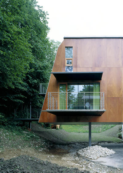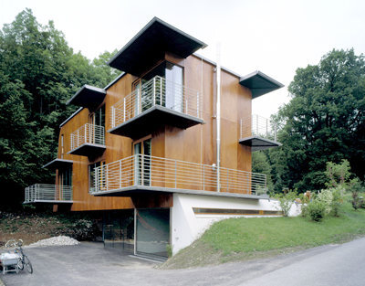Der Bauherr kommt aus einer Tischlerfamilie, betreibt sein Gewerbe mit akribischer Perfektion und wollte einen edlen Holzbau. Im Norden neben dem früheren Haus waren 656 Quadratmeter Grund von komplexer Landschaftsformation frei. An der Straße im Westen ist ein Böschungsstreifen, dahinter fällt das Gelände stark ab, um sich als grüner Rücken südwärts eine Waldlichtung hinaufzuschwingen. Auch den Osten säumt ein Hang, zwischen beiden Hügeln schmiegt sich eine sanfte Mulde talwärts in Nachbars Garten.