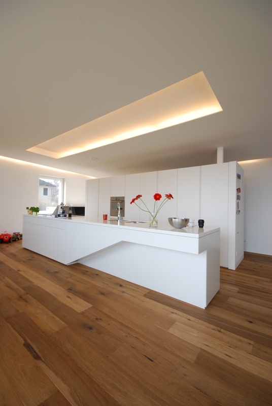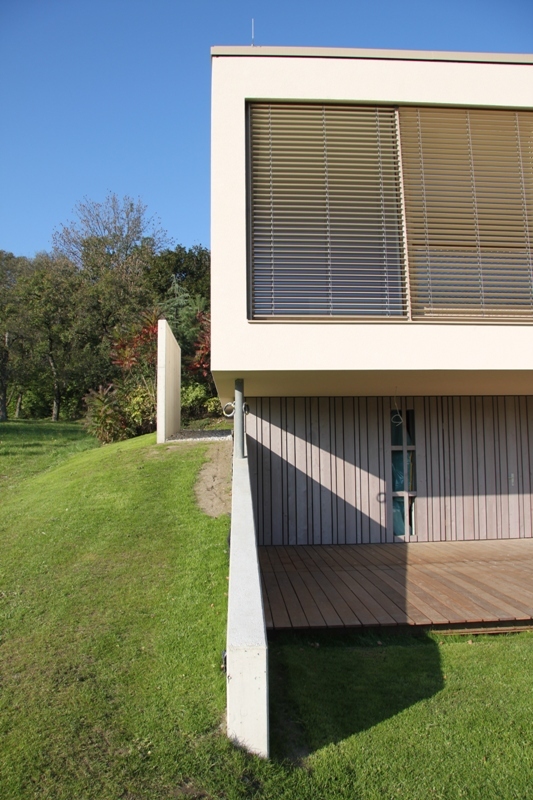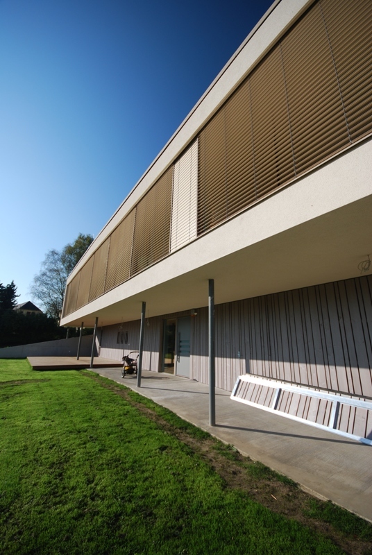 Südansicht - Das mit einer grossen Baukörperlänge konzipierte Gebäude ist nach vorne hin sehr offen geplant. Das Dach erfährt in der Mitte einen Knick, womit der Baukörper in seiner Länge gebrochen wird und dadurch in seiner Erscheinung, Spannung und Ungewohntes erzeugt.