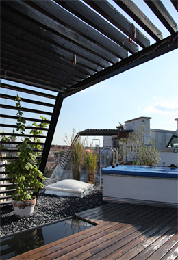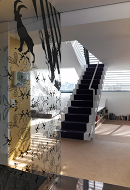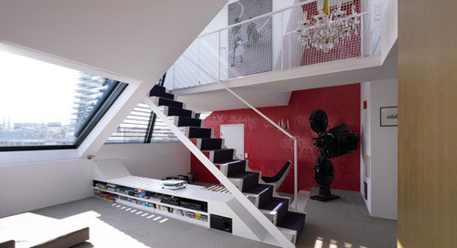 Eine schlanke, elegante Stahltreppe in Weiß verbindet die obere mit der unteren Ebene, auf der sich der Wohnungseingang befindet.