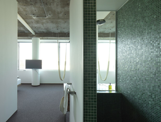 Die (Doppel)Zimmer sind ein Kapitel für sich. Sie bewegen sich in der Größenordnung von 16 (Standard) bis 26 Quadratmetern (Eckzimmer, eine Suite) und sind so knapp bemessen, dass der Architekt kleine Nischen einführen musste, um das Doppelbett unterzubringen und am Fußende doch noch vorbeigehen zu können. Das Ganze funktioniert wie ein Reißverschluss. Die Nischen sind verschränkt: Im einen Zimmer ist dieses Doppelbett nahe am Fenster, im anschließenden nahe an der Tür. Mit den Duschkabinen verhält es sich umgekehrt: Einmal sind sie ganz nah am Fenster (geschützt durch ein Rolleau), im anderen Fall nahe dem Eingang. In jedem Fall sind sie aber, im Verhältnis zum Minimalismus der Zimmer, sehr angenehm dimensioniert.
