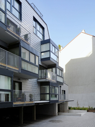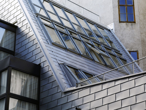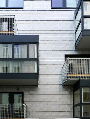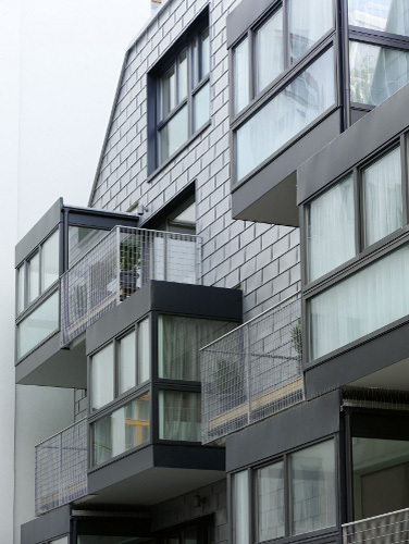 Schuppenfassade als Kontrast zu den verpitzten Fassaden des Bestandes aus der Gründerzeit