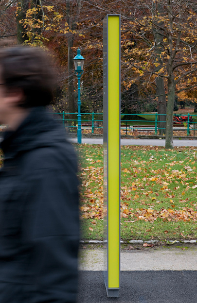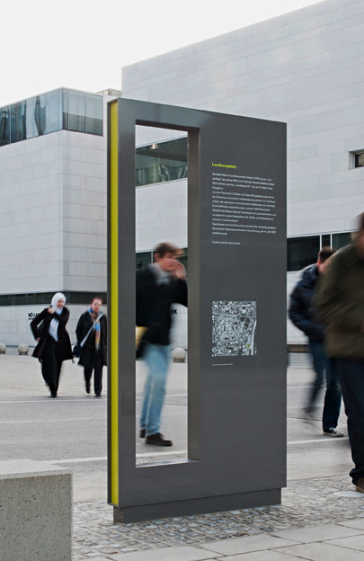 Die Grafikerin Gabriele Lenz und die Architektin Anja Mönkemöller konnten den Wettbewerb unter sechs Teams für sich entscheiden, mit einem Konzept, das durch funktionalistische Präzision beeindruckt, sowohl wasdie architektonische Durchbildung der Info-Stelenfamilie, als auch den typografischen Auftritt der eigentlichen Informationen in applizierter Text- und Planform betrifft.