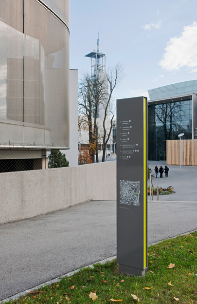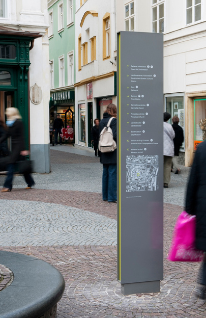 Die formal einheitlich in anthrazitgrau gehaltenen, pulverbeschichteten Stahlelemente mit einem gelbgrünen Signalstreifen an den Schmalseiten, die seit wenigen Wochen in Sankt Pölten aufgestellt sind und durch perfekte Materialbearbeitung im Detail beeindrucken, gibt es in drei aufeinander bezogenen Modellen: Wegweiser-Stelen, Gebäudetafeln an Hausmauern und Platz-Stelen. Die 220 Zentimeter hohen Wegweiser, auf denen ein Orientierungsplan und die angeführten Zielobjekte Aufschluss über den Weg zu diesen geben, funktionieren als konventionelle Hinweistafeln an den Gehwegen im städtischen Gefüge. An den bezeichneten Orten angekommen, findet sich nun entweder eine an der Hausmauer montierte Gebäudetafel oder eine den Ort beschreibende großformatige Platz-Stele. In einer zweiten Ausbaustufe 2010 werden in formal gleicher Art je ein Info-Pavillon beim Bahnhof und in der Mariazeller Straße realisiert werden.