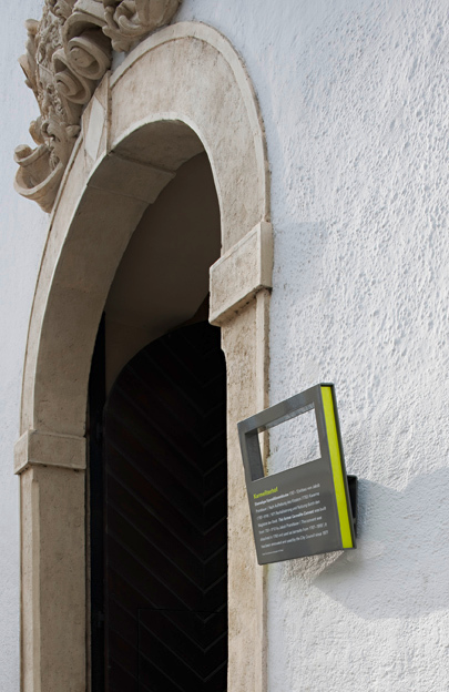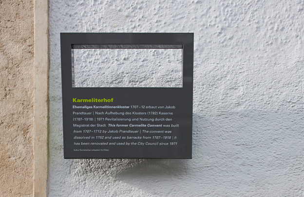 Sankt Pölten hat mit seinen 50.000 Einwohnern eine ideale Größe um von Kulturinteressierten an einem Tag zu Fuß erforscht zu werden, und genau diese Qualität hat die Stadtgemeinde, respektive Bürgermeister Matthias Stadler, aufgegriffen, um dies maßstabsgerecht zu kommunizieren. Vor zwei Jahren veranstaltete der Magistrat von Sankt Pölten einen geladenen Wettbewerb für Grafik-Designer in verpflichtender Kooperation mit Architekten zur Planung eines „Kultur-Touristischen Leit- und Informationssystems“, das einerseits Stadtbesucher von auswärts, andrerseits die ortsansässige Bevölkerung in ihrem Interesse „abholen“ und zu den Sehenswürdigkeiten der Landeshauptstadt führen sollte. Gleichzeitig wusste man um die Notwendigkeit, die Besucher des historischen Stadtzentrums auch an das in den 1990er-Jahren errichtete Regierungsviertel mit seinen architektonisch anspruchsvollen Kulturbauten wie Landesbibliothek, Festspielhaus und Landesmuseum außerhalb des Ringes um die Altstadt heranzuführen. Man wollte ein standfestes Leitsystem, das sich ohne Sponsoren-Logo behaupten kann und dessen Einzelelemente an verschiedenen Standpunkten im Stadtraum die Wege weisen. Man wollte keine Audioguides, die man sich bei der Tourismusinformation abholen und wieder abgeben muss und auch keine übers Touchscreen-Handy abrufbaren Multimediashows.