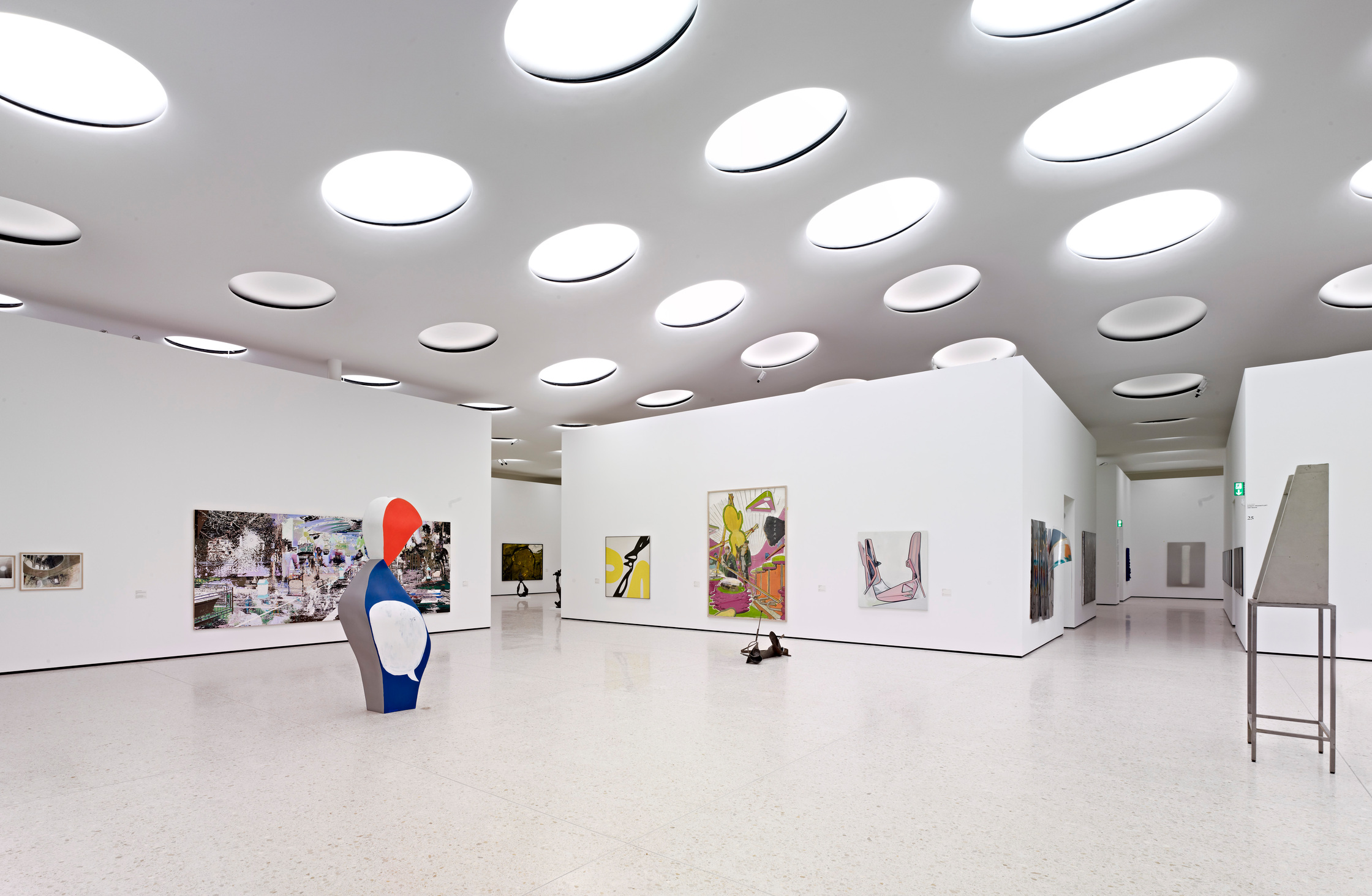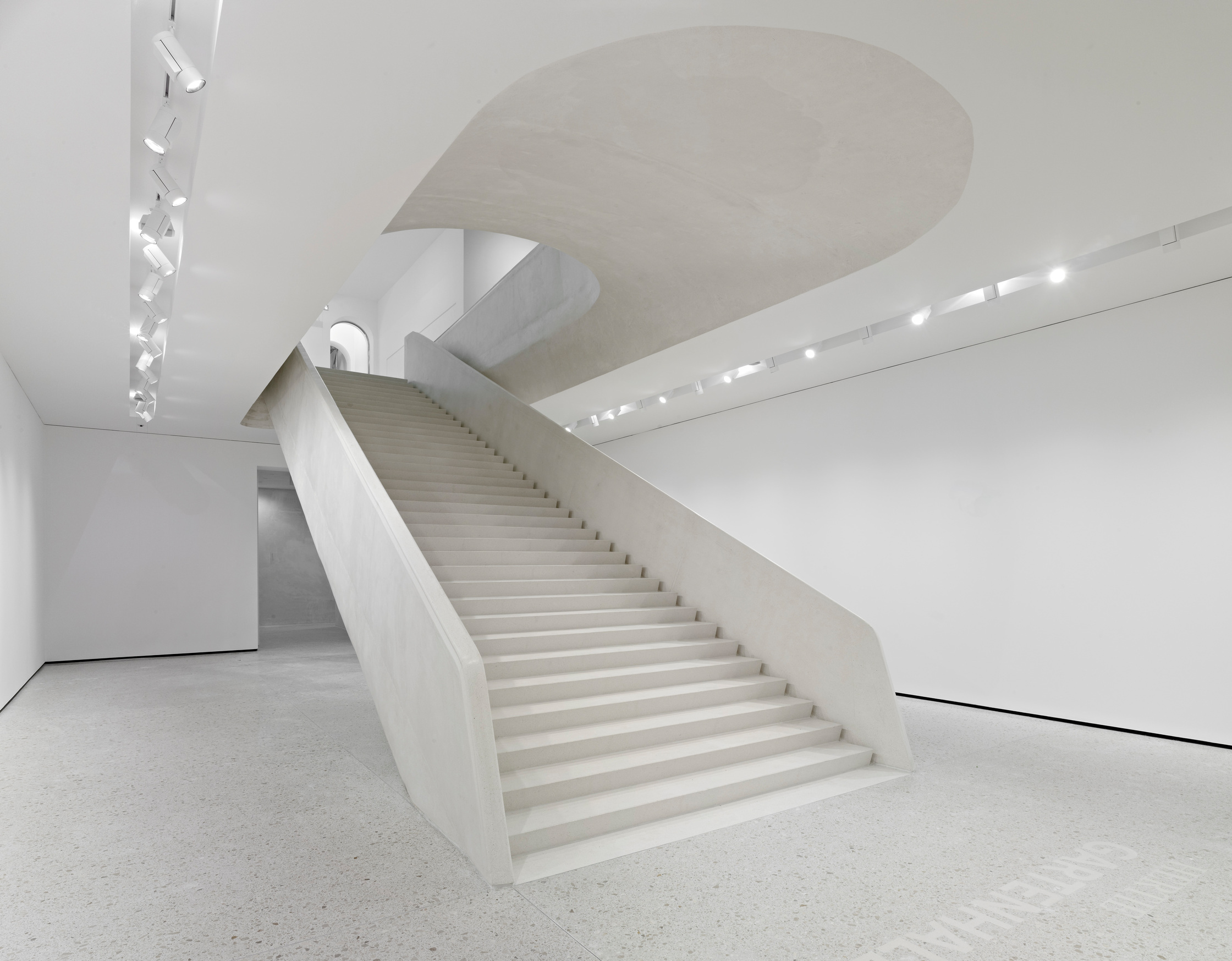 Architektonisch erhebend ist das Eintreten über die helle Stiege, die wie in den Stein geschnitten scheint. Über sie taucht man ein in eine strahlend helle Höhle der Kunst. Ernüchterung erfolgt am Treppenfuß: auf gesamter Breite in den Terrazzoboden eingelassen findet sich der Name jener Stiftung, die mit sieben Millionen den Bau anschob: „Hertie-Gartenhallen“. Ein Branding der Halle, so banal und aufdringlich wie die Orientierungshilfen einst im Kaufhaus Hertie selbst. Willkommen im Tiefgeschoß.