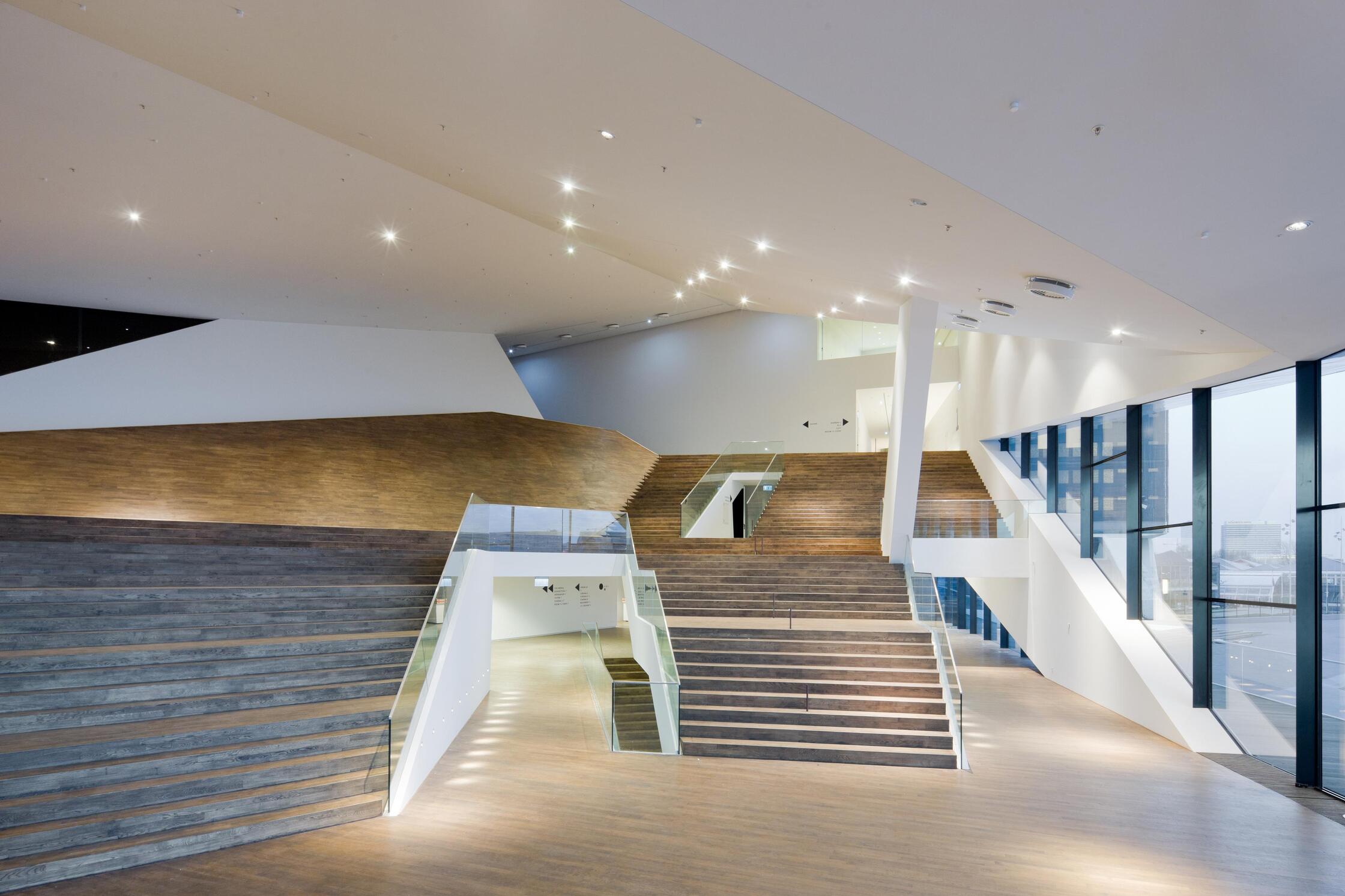 Die Architekten haben sich einen recht langen Weg ausgedacht, der ins Gebäude hineinführt. Man betritt es genau genommen in der ersten Etage, im Basement sind die Büros, auch Restaurierungswerkstätten etc. Aber wenn man diese lange Freitreppe erst einmal überwunden hat, dann kommt man schon einmal auf eine großartige Terrasse. Großartig und sehr groß, ein fantastischer Blick auf den Fluss und das Gegenüber bietet sich einem. Und groß geht es auch drinnen weiter. Eine solche räumliche „Verschwendung“ sieht man selten. Man kommt in eine Art riesiges Atrium mit sehr viel dunkel geöltem Eichenholz, das künftig Café, Bar, Restaurant enthalten wird, das Aufenthaltsraum ist – und auch geeignet für jedes und alles an temporären Events. Natürlich sind die Decken höhenmäßig verschnitten, das steigert sich von niedrig bis ganz hoch, da wächst auch einmal organisch aus einer ansteigenden Arenatreppe eine Bar heraus; man könnte sagen: Es wuchert, aber nach Regeln. Und das Ganze wird dann durch die wunderbaren Leuchtkörper von Olafur Eliasson – einem Serienprodukt von Zumtobel – atmosphärisch sehr effektvoll gesteigert.