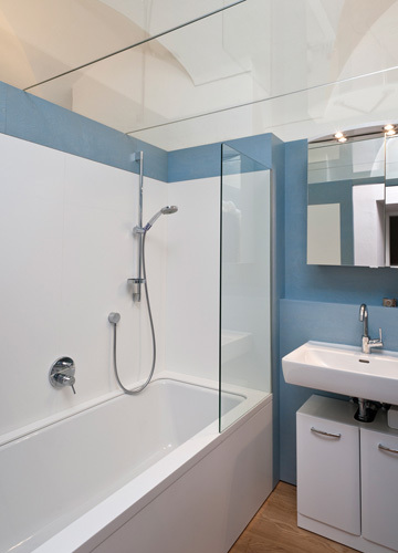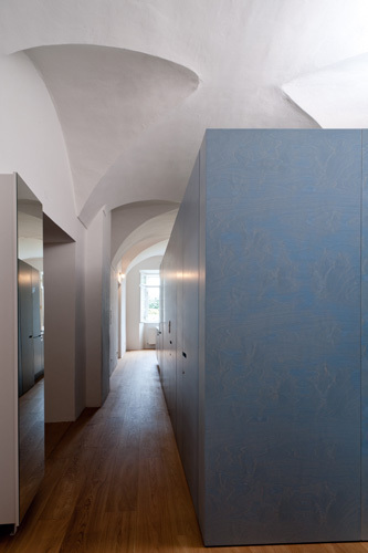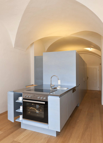 Das für die Wohnung charakteristische verputzte Kreuzgratgewölbe bleibt durch die niedrige Höhe des Möbels von 2,20 m gut sichtbar und kommt durch den dunklen Boden voll zur Geltung.