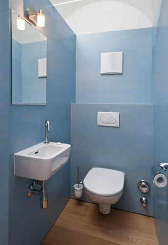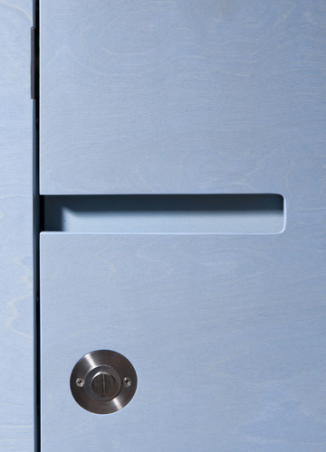 Das „Einbaumöbel“ fasst die Funktionen Küche, Abstellraum, Bad und WC zusammen und liegt als „Raum im Raum“ im Eingangsbereich.