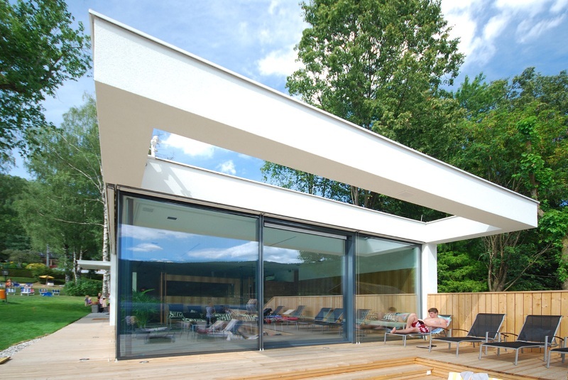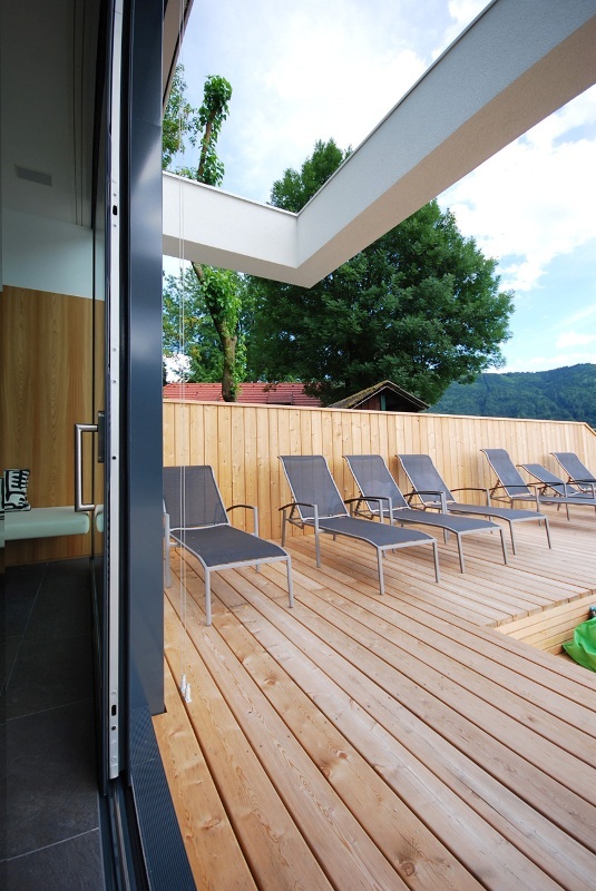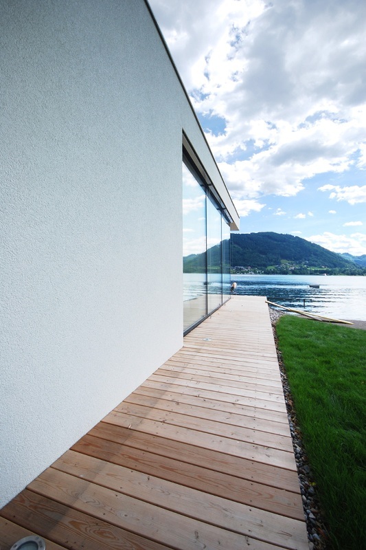 Der außenliegende Liegebereich mit einem Steg, welcher in den See reicht, wird gegenüber der Sauna vertieft angeordnet, dadurch wird eine Sichtbeeinträchtigung der Saunabesucher gegenüber den Liegenden vermieden.