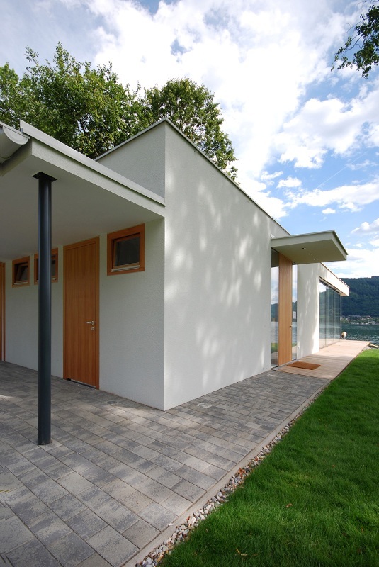 Durch die Positionierung des Gebäudes wird eine räumliche Trennung des Grundstückes verhindert und die Durchsicht zum Seeufer gewährleistet
