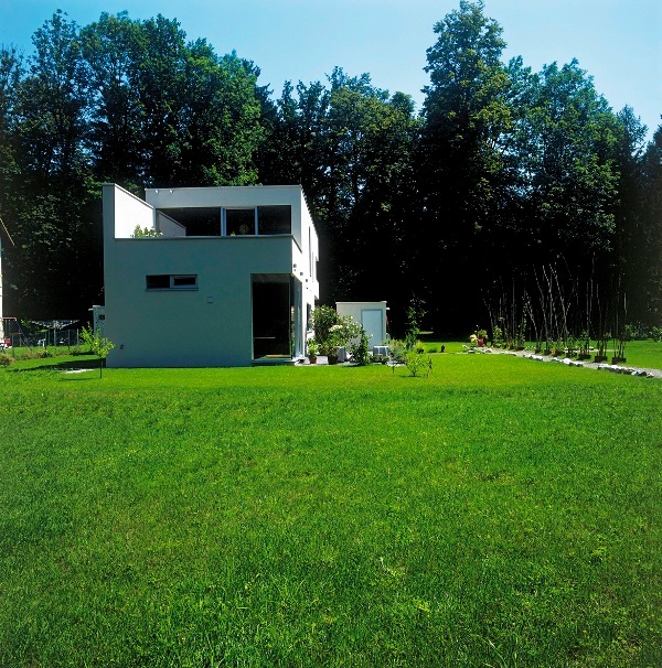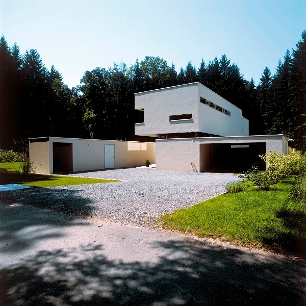 Der Hauptbaukörper mit Garage bzw. der Schuppen werden so positioniert, dass im Ankommensbereich eine Hofsituation entsteht, welche gleichzeitig den Straßenraum vom privaten Grünraum trennt.