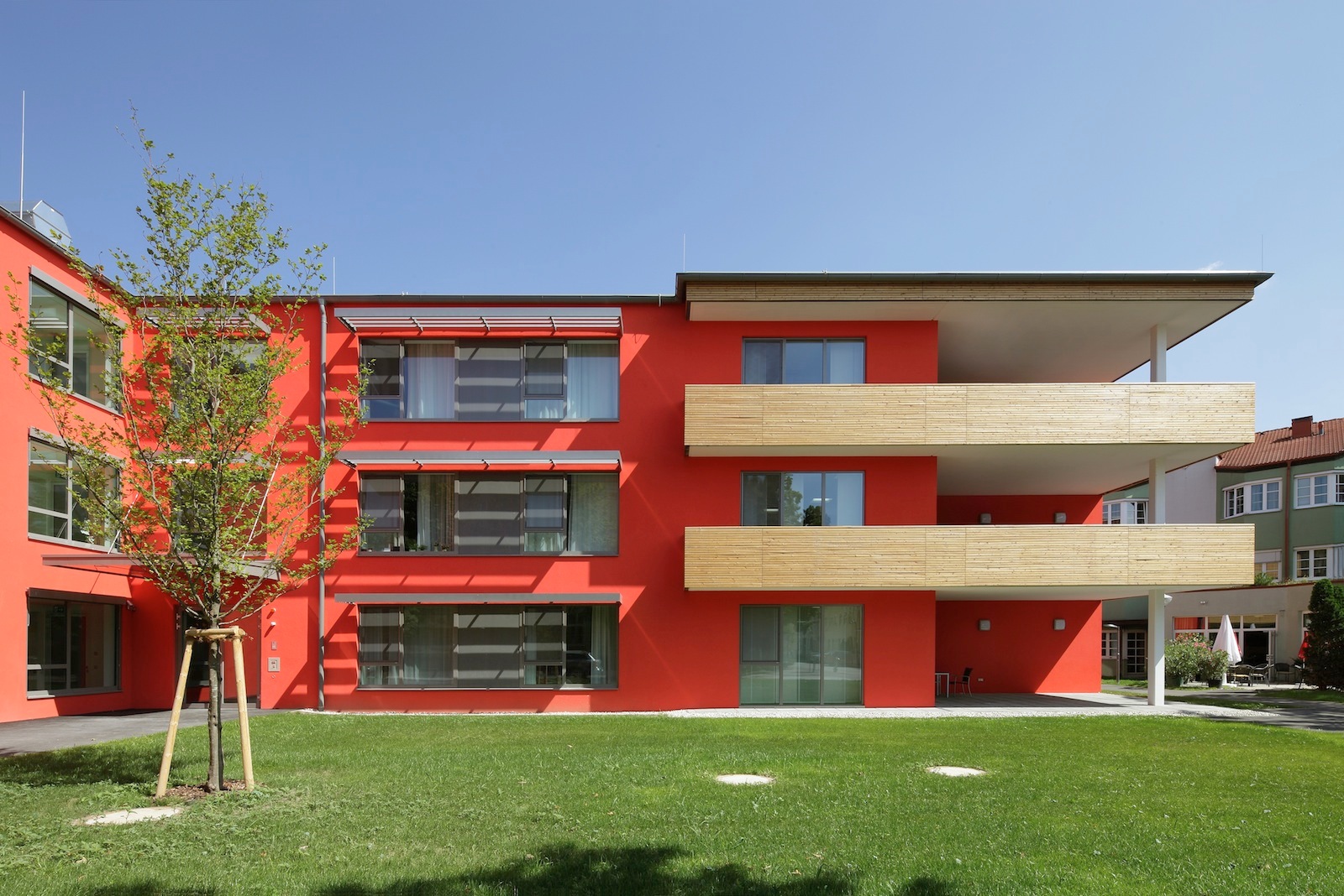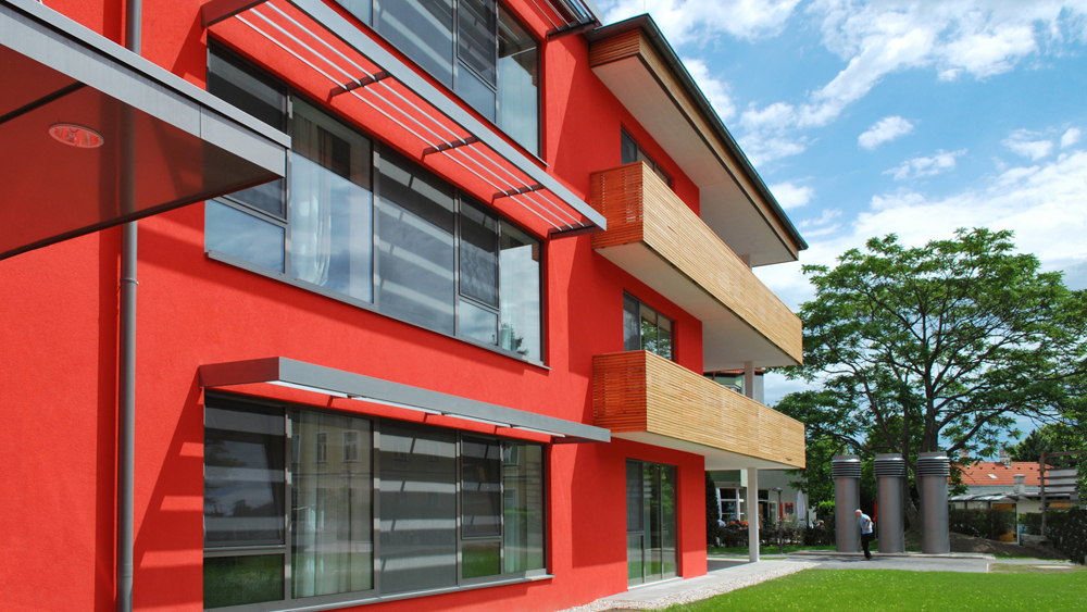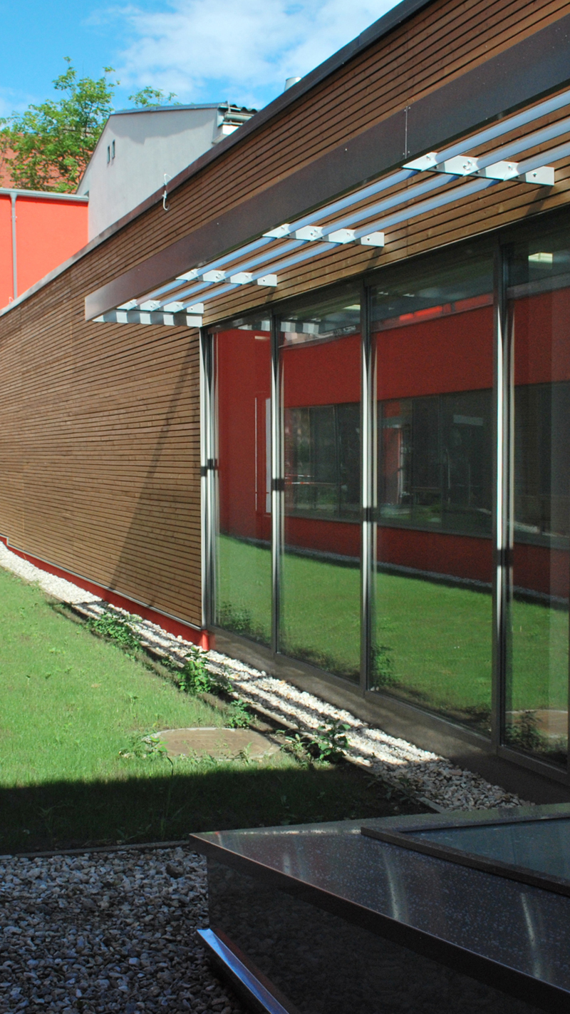 Der gesamte Neubau wird mit einer Vollwärmeschutzfassade, teilweise mit Holz verkleidet, in Niedrigenergie – Ziegelbauweise errichtet.