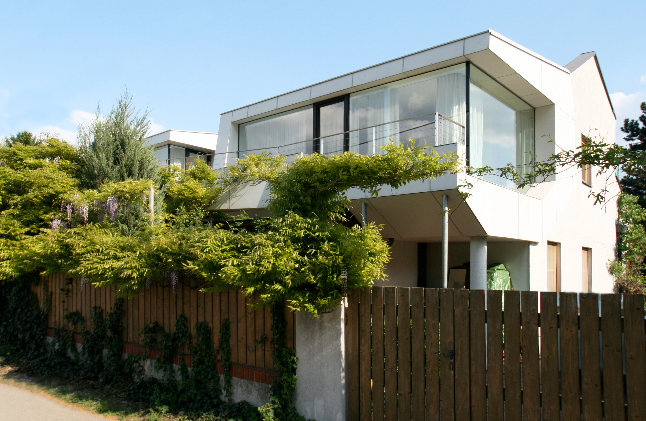 Die einheitliche Materialwahl – für die Fassade des Dachausbaues sowie des Balkons wurden Eternit-Großformattafeln eingesetzt – verstärkt die Eigenständigkeit des neu geformten Körpers und macht ihn als solchen ablesbar.