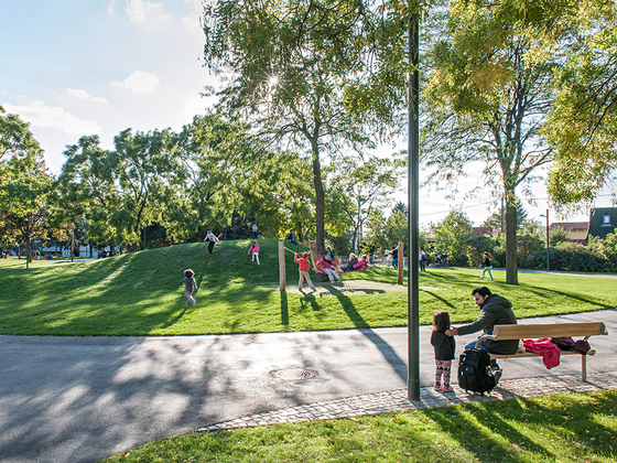 In einer ersten Baustufe wurde das Wiltener Platzl mit wenigen Eingriffen zu einem lebendigen und attraktiven Stadtteilplatz transformiert. Der Platz erhielt ein einheitliches Niveau und eine durchgängige Oberfläche aus Hartberger Granit, die als heller Steinteppich den Platz großzügig erscheinen lässt. Eine lang gezogene zentrale Sitzbank mit Trinkbrunnen, zwei Bäume und Sitzmöglichkeiten aus Granitblöcken strukturieren den Platzraum und laden zum konsumfreien Verweilen ein. Die offene, nutzungsneutrale Gestaltung und die zur Verfügung gestellte Infrastruktur (Strom und Wasser) machen es möglich, dass der Platz flexibel bespielbar ist – vom wöchentlichen Bauernmarkt bis zu kleineren Konzerten und Events. Besonders erfreulich ist, dass im Zug der Neugestaltung auch die Anrainer investierten, Häuser renoviert wurden und Lokale mit kleinen Gastgärten den Platz beleben. (Text: Claudia Wedekind)