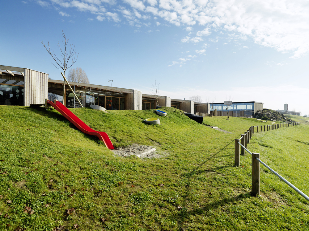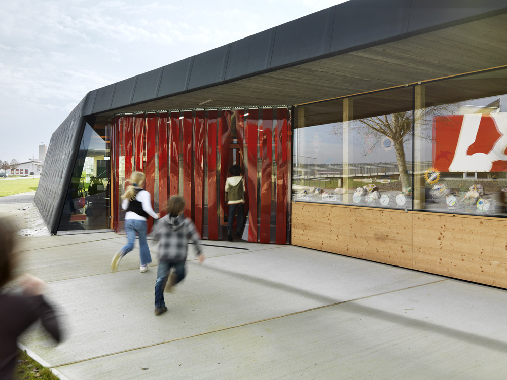 Bei der Annäherung könnte man das Schulgebäude glatt übersehen. Der lang gezogene, straßenbegleitende Baukörper liegt flach in der Wiese, nur ein Geschoß hoch und von der Einmündung in den Zufahrtsweg her fast nicht zu sehen, weil der Schüttwall des teilweise eingegrabenen Turnsaals den südlichen Abschluss bildet. Kein mächtiges Dach krönt das Haus, kein Ehrfurcht einflößender Zugang mit Stufen oder Schwellen ist sein Entree. Ein schräg geneigter Vorbau, gepolstert und tapeziert mit der dunklen Folie, die auch für das flach geneigte Dach verwendet wurde und sich im schmalen Dachsaum des Vordachs fortsetzt. Darunter Massivholzfassaden und dort, wo keine Öffnungsflügel sind, große Glasflächen mit einfacher rahmenloser Verglasung. Dazu die Verkleidung der Außenwände an den Schmalseiten und an der langen Klassenfront mit vorvergrauten Brettern. Anstelle eines teuren Windfangs, dessen Türen zu Unterrichtsbeginn und –ende sowieso immer offen stünden, installierten die Architekten einen einfachen Industrievorhang aus reißfesten Gummistreifen, wie er in der Landwirtschaft verwendet wird.