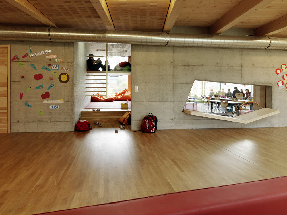 Nein, diese Schule will kein Autorität ausstrahlendes Bauwerk sein, das sich von der Lebensrealität der Menschen im Ort abhebt. Sie hat Werkstattcharakter und unterscheidet sich vielleicht gar nicht vom Betrieb, im den Vater oder Mutter täglich zur Arbeit gehen. Betritt man die Schule, so wechseln Atmosphäre und Anmutung. Holz auf dem Boden, an den Wänden von Werkraum und Lehrerzimmern und an der Decke, die diesen straßenseitigen Bauteil überspannt, prägt den ersten Eindruck. In so viel Materialwärme fügt sich die lange Sichtbetonwand, die das Rückgrat der Klassen bildet, harmonisch ein. Zwischen den lose verteilten Raumgruppen auf der einen und dem Klassentrakt auf der anderen Seite spannen die Architekten über die gesamte Gebäudelänge einen weit mehr als hundert Quadratmeter großen Raum auf, der sich vom Flur über die Eingangshalle zur großzügigen Pausen- und Mehrzweckfläche aufweitet.
