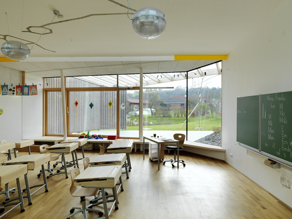 Es ist ein offener Bereich, der der Erkenntnis Rechnung trägt, dass Kinder Laufen, Springen und Toben brauchen, um dann wieder konzentriert und kreativ arbeiten zu können. Rampe, Sitzstufen und Bücherinseln gliedern diesen offenen Raum, eine tiefe Lesenische ist intimer Rückzugsraum auf zwei Ebenen. Jedes Detail ist sorgfältig geplant und erfüllt mehr als eine Funktion: die Verglasung vom Klassen- zum Pausenraum ist Durchblick und zugleich Sitzbank, die niedrigen Parapete der Klassen sind Sitz- und Arbeitsfläche, Ablage und Stauraum. Klassentrennwand und Fassade sind jeweils polygonal geknickt. Immer wieder, an vielen Stellen, brechen Feyferlik und Fritzer die Strenge der Orthogonalität, die für sie Symbol einer antiquierten Schulform mit Frontalunterricht ist. Ihre Klassen können über Verbindungstüren zusammengeschaltet werden, und jeder ist eine Freiluftklasse vorgelagert. Eine wind- und teils regengeschützte Terrasse, über Glas und ein breites Schiebeelement mit dem Innenraum verbunden, soll zum Unterricht im Grünen motivieren.