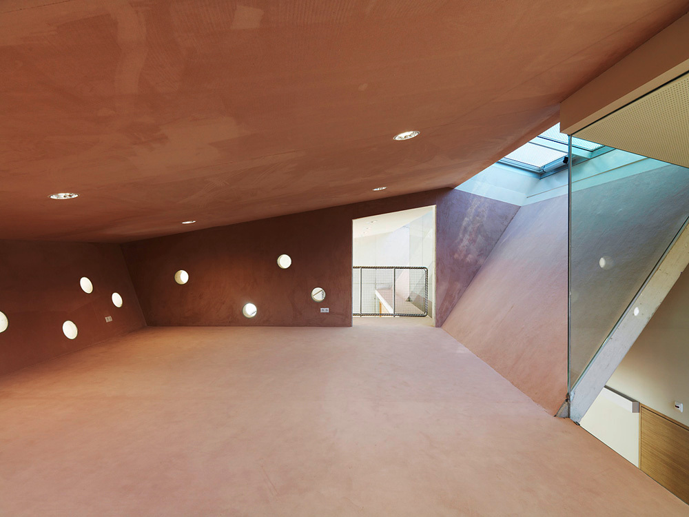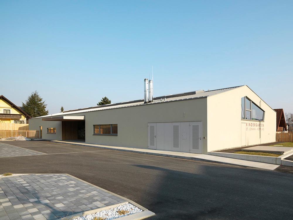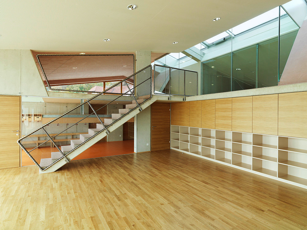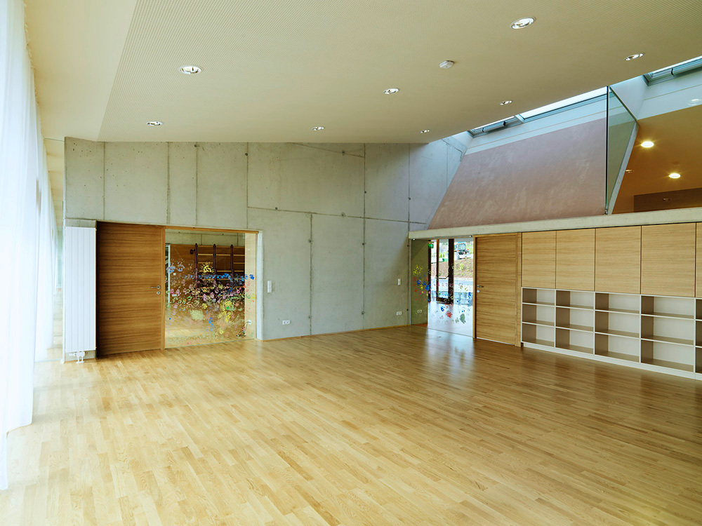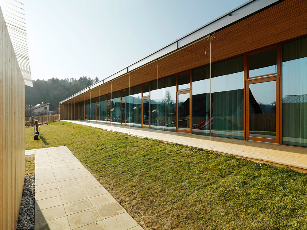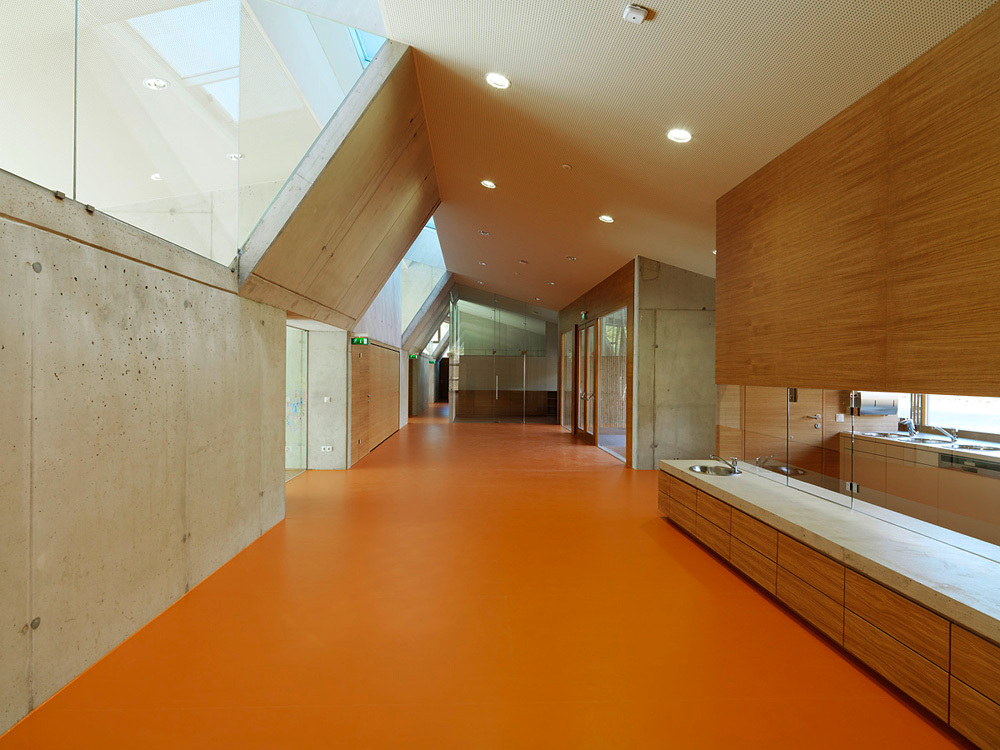 STB-Massivbauweise mit Aussendämmung. Mischkonstruktion aus tragenden STB-Scheiben, einem Blech gedeckten STB-Dach und Holz-Glas-Ausfachungen. Hackschnitzelheizung.