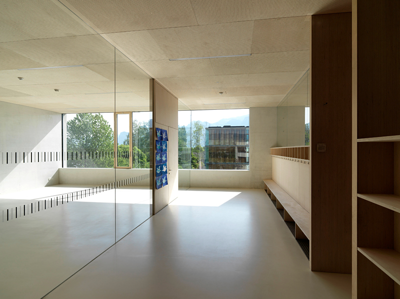 Der Neubau hat wie der Bestand eine – allerdings hinterlüftete – Putzfassade (ökologischer Vorteil: kein Verbundbaustoff); massive Wände, Treppen und Böden aus Weißbeton, Innenausbau mit unbehandelten Birkensperrholzplatten.