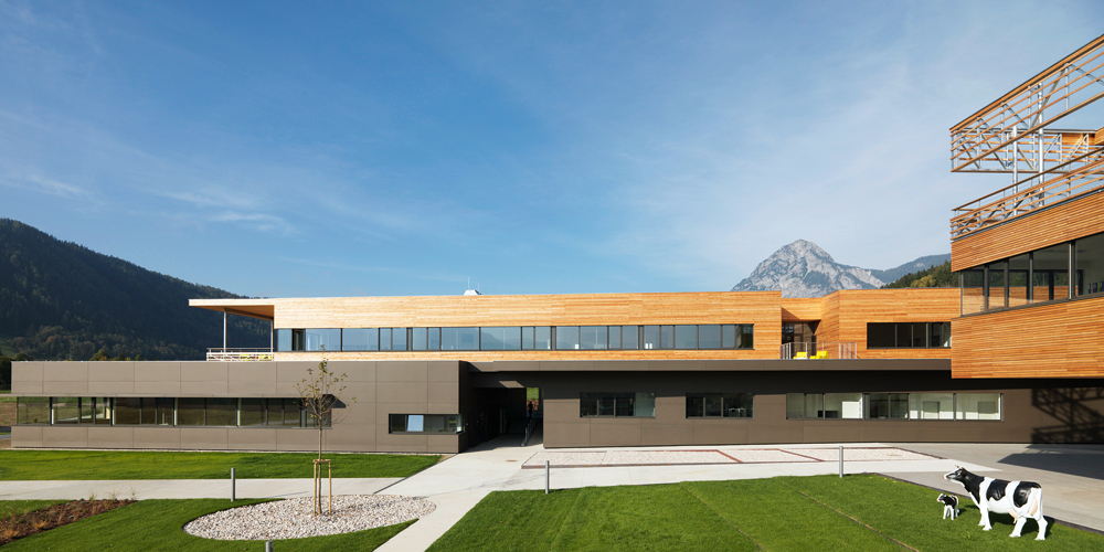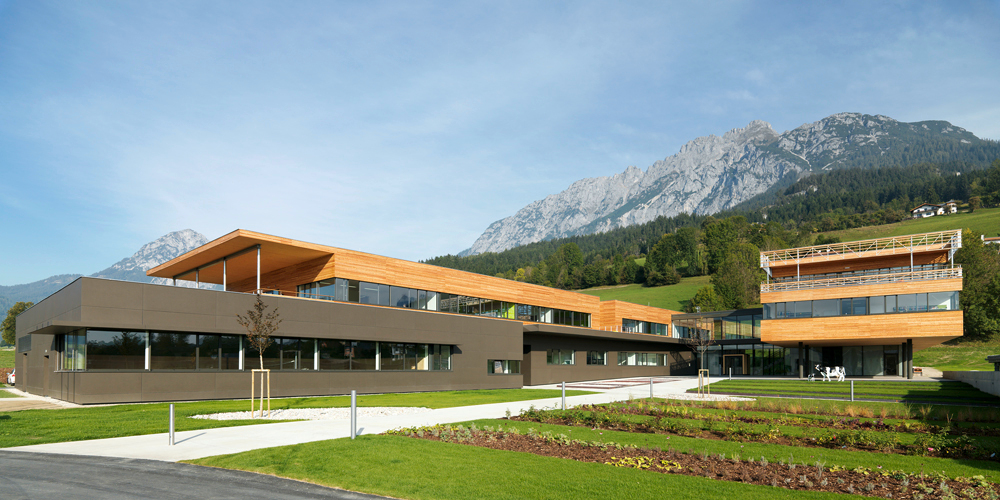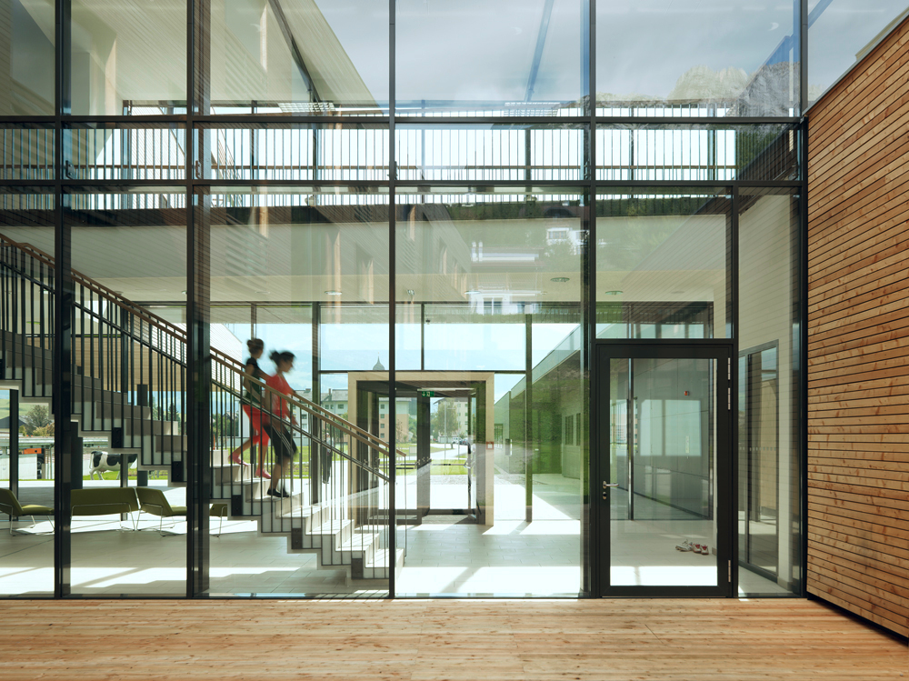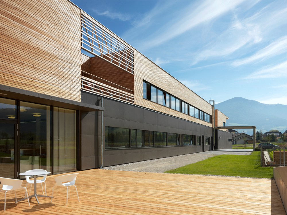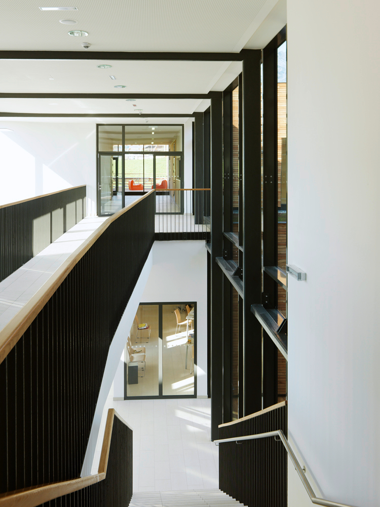 EG: Massivbau / 1. + 2. OG: Holzbau / Verbindungsbau: Stahl-Glasbau.