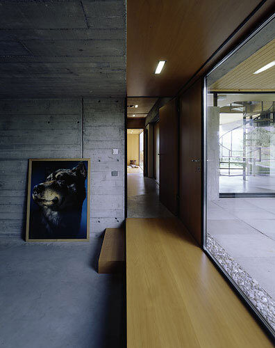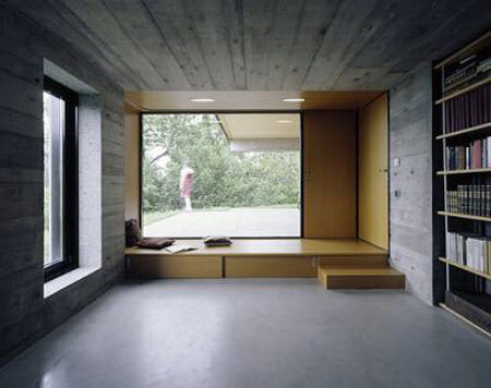 Gänzlich ins Erdreich eingeschoben, müssen die Räume mit einer einseitigen Belichtung auskommen, doch das tun sie auch. Die Stimmung ist ein wenig schummrig und erdig, nicht zuletzt durch die Belassung der Sichtbetonflächen im Innenraum. Einzig und allein zum vollflächigen Fenster schließt ein Holzpodest den Raum gemütlich ab.
