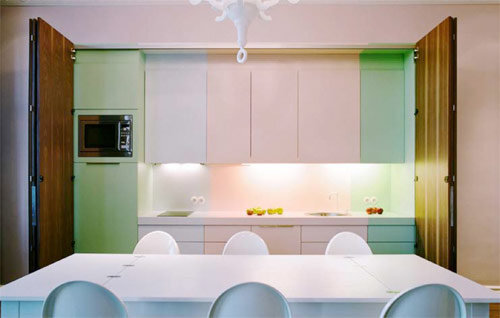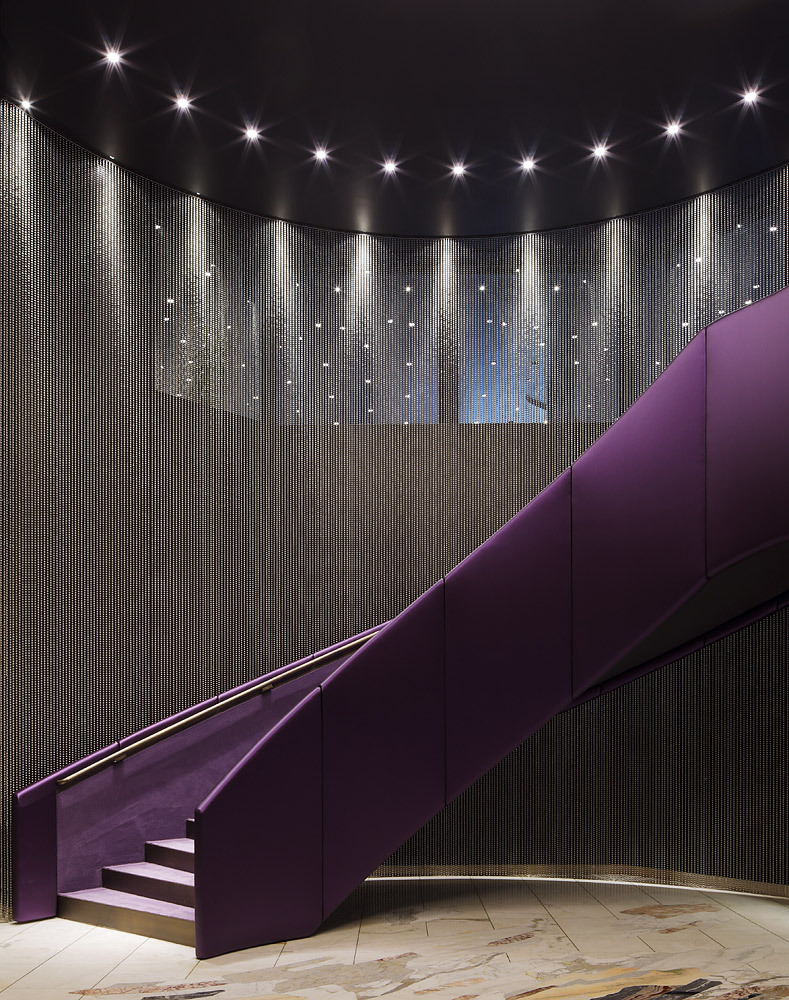 Über die geschwungene, als Volumen neu interpretierte, Treppe gelangt man in das Restaurant im ersten Stock. Durch Wandöffnungen wird es zum Teil des Foyers, wobei beidseitig angebrachte raumhohe Ketten-Vorhänge als Filter dienen.