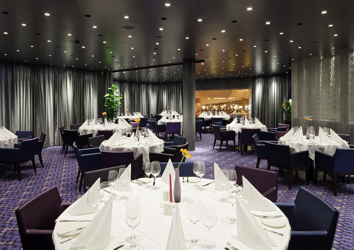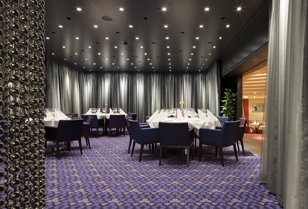 Schwere Vorhänge fungieren als Raumteiler, die bei Bedarf séparéeartige Räume herstellen. Der von Gregor Eichinger entworfene Teppich nimmt das Thema Casino mit einem Muster aus Spielkartenmotiven auf.