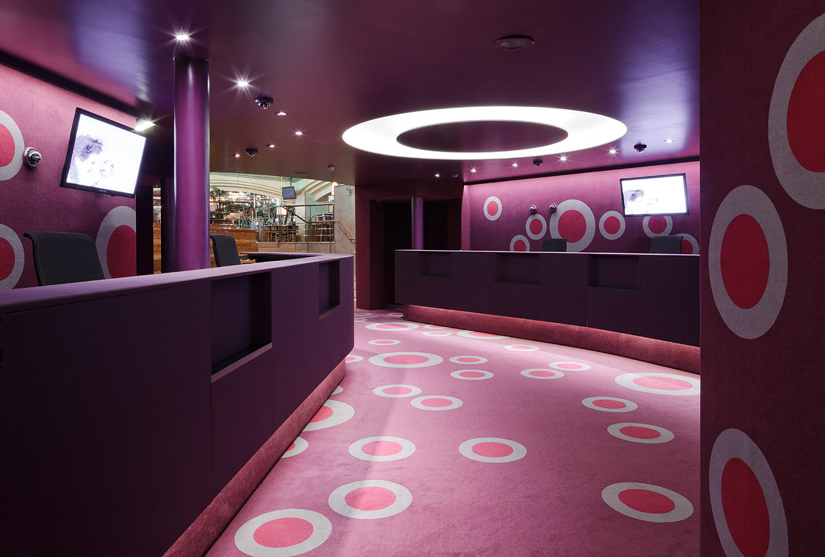 Rezeption: Brombeer- und Magentatöne ziehen sich von Decke über Wände und Boden bis zu den Oberflächen der Einbauten durch. Das Teppichmuster nimmt ein Element des Casinos auf – die Jetons. Die Tresen sind mit einem Stoff bespannt, mit dem auch Spieltische bezogen sind, und stimmen die Besucher dadurch auch haptisch auf das Casinoerlebnis ein.
