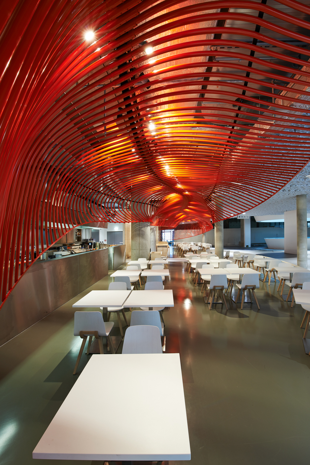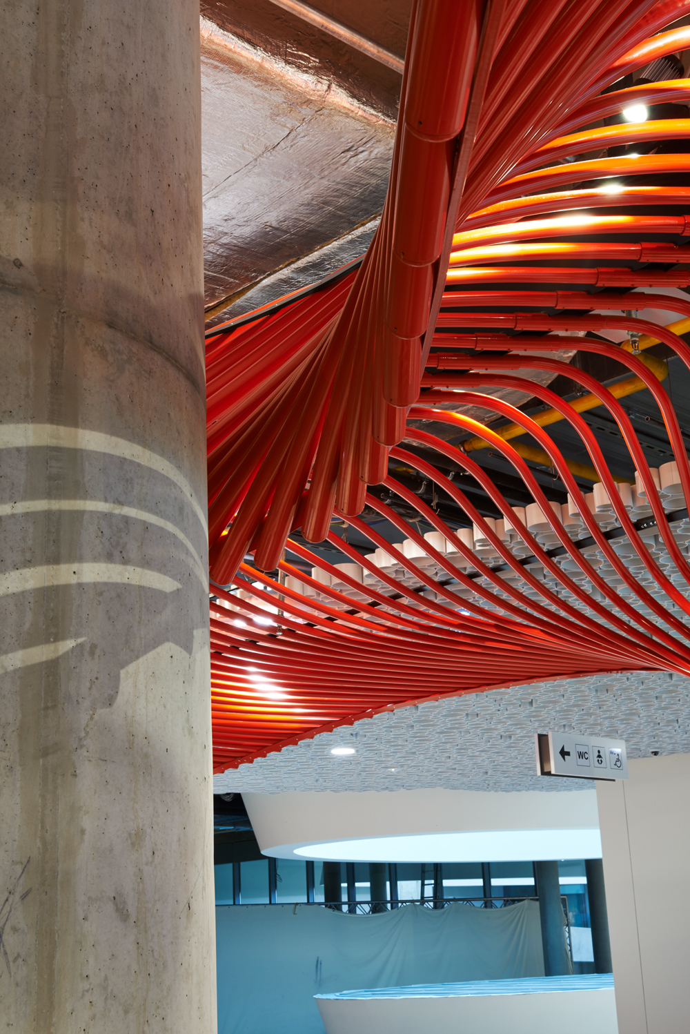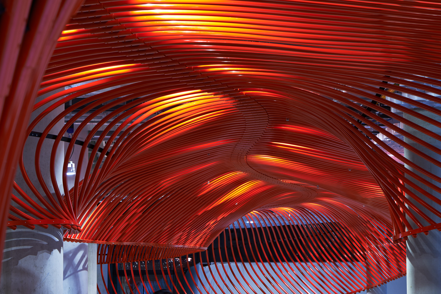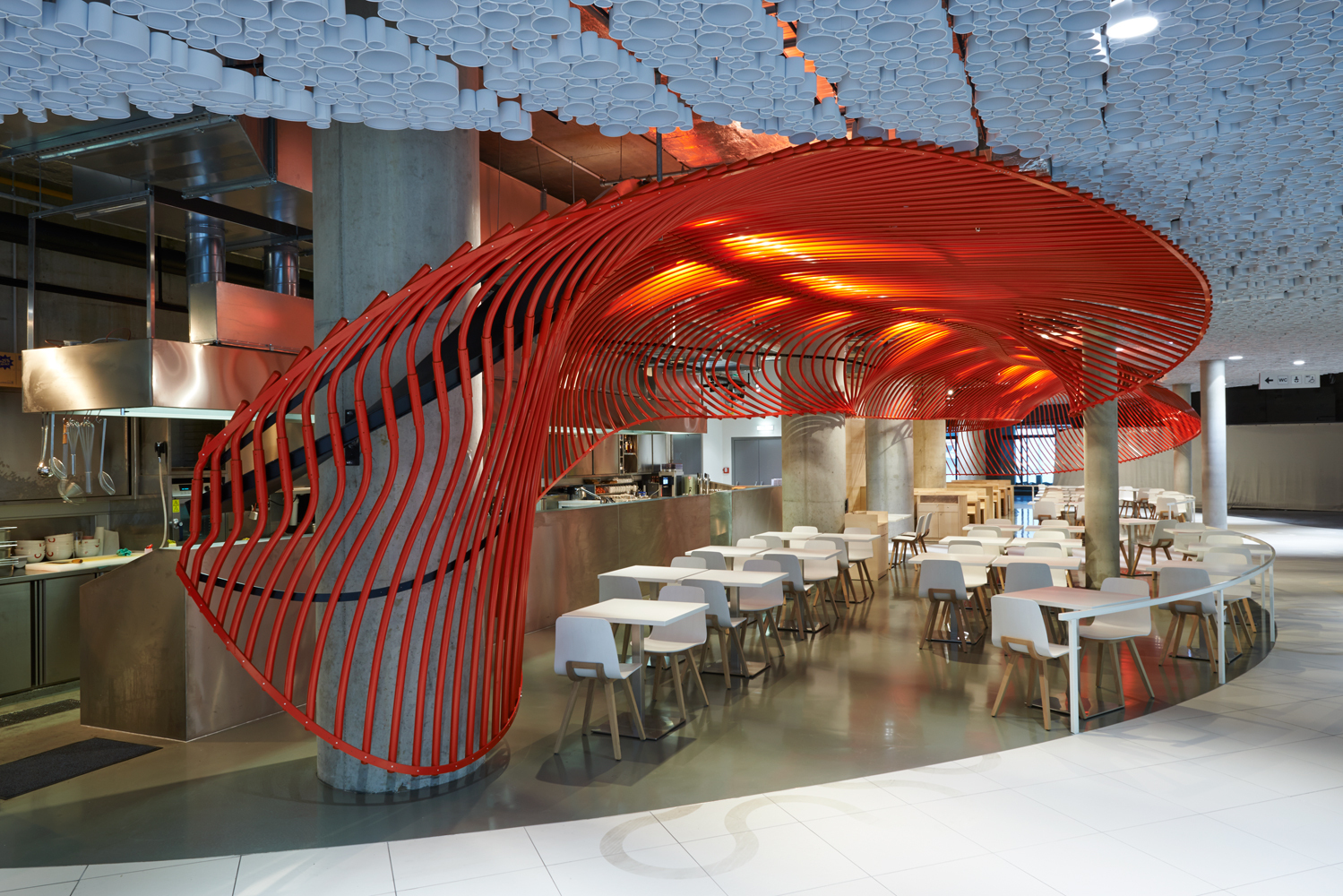 466 pulverbeschichtete Aluminiumröhren bilden als hängende Skulptur eine fliegende Rahmung des Lokals.