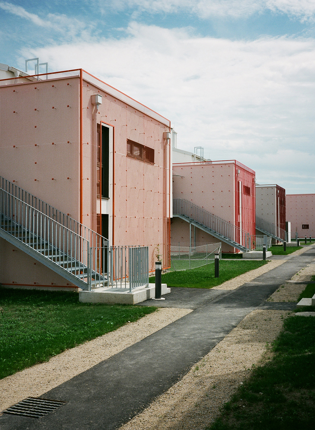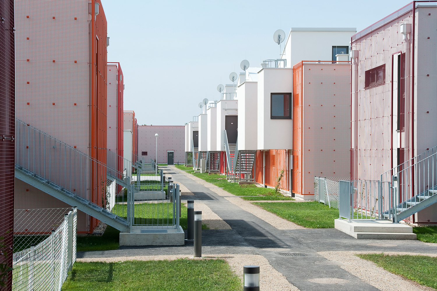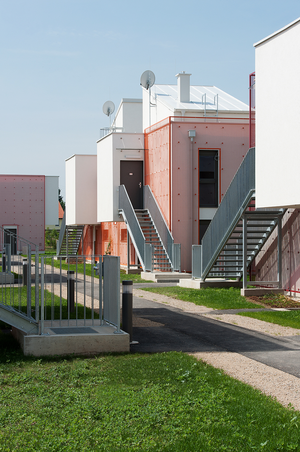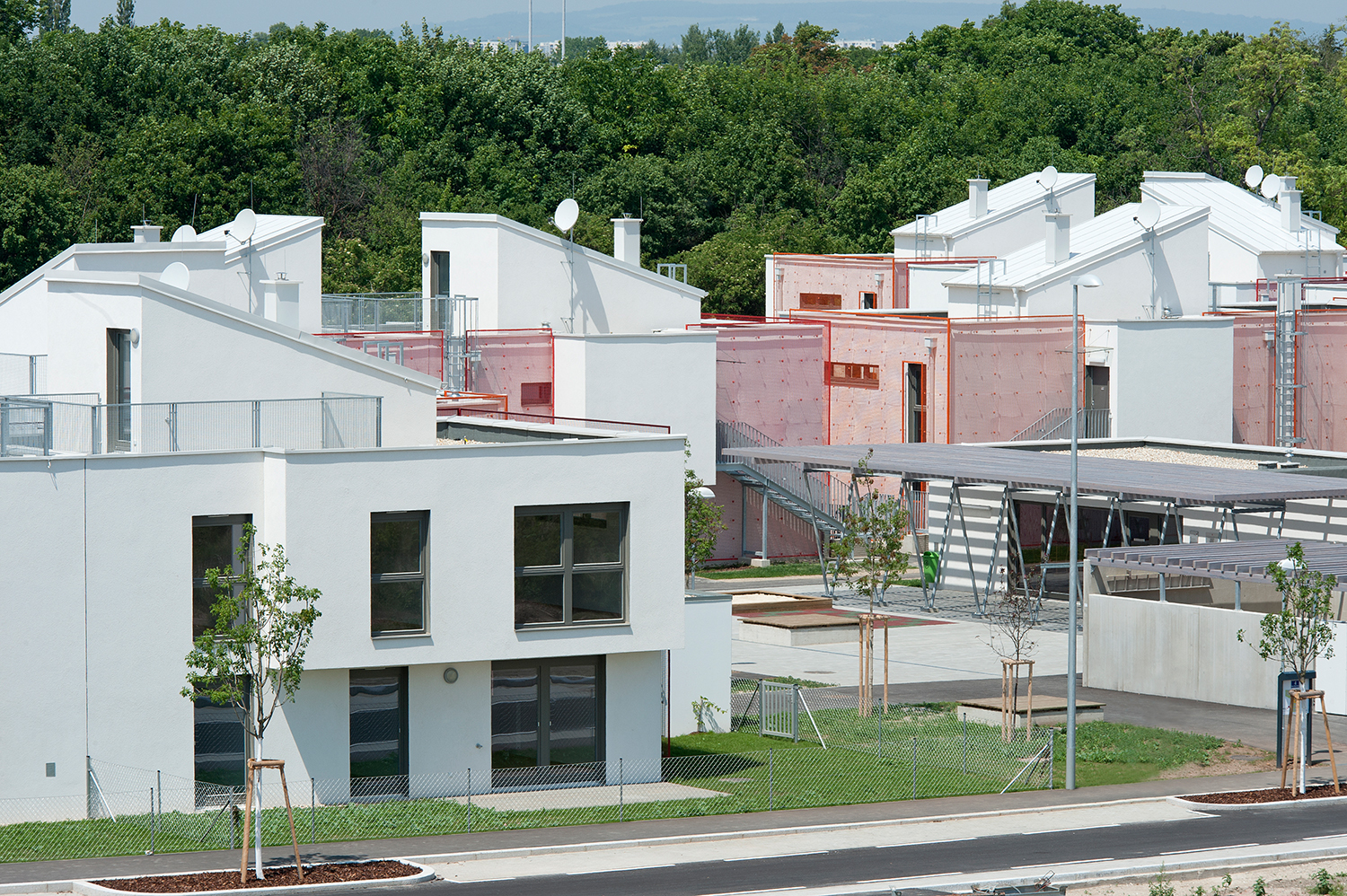 Auf drei Bauplätzen entstanden Wohnhäuser unterschiedlicher Typologien, die hinsichtlich Höhe und Dichte in drei Stufen Richtung Grüngebiet abgestuft sind.