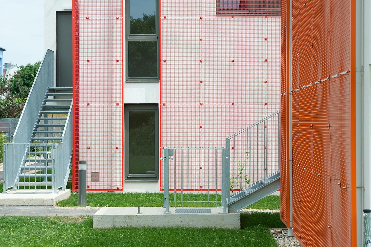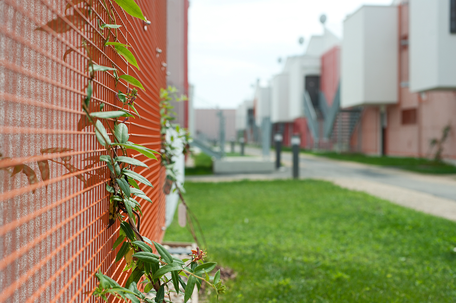 An den Außenwänden befinden sich vorgehängte Rankgitter in den Farben Orange, Tomatenrot und Rosarot.