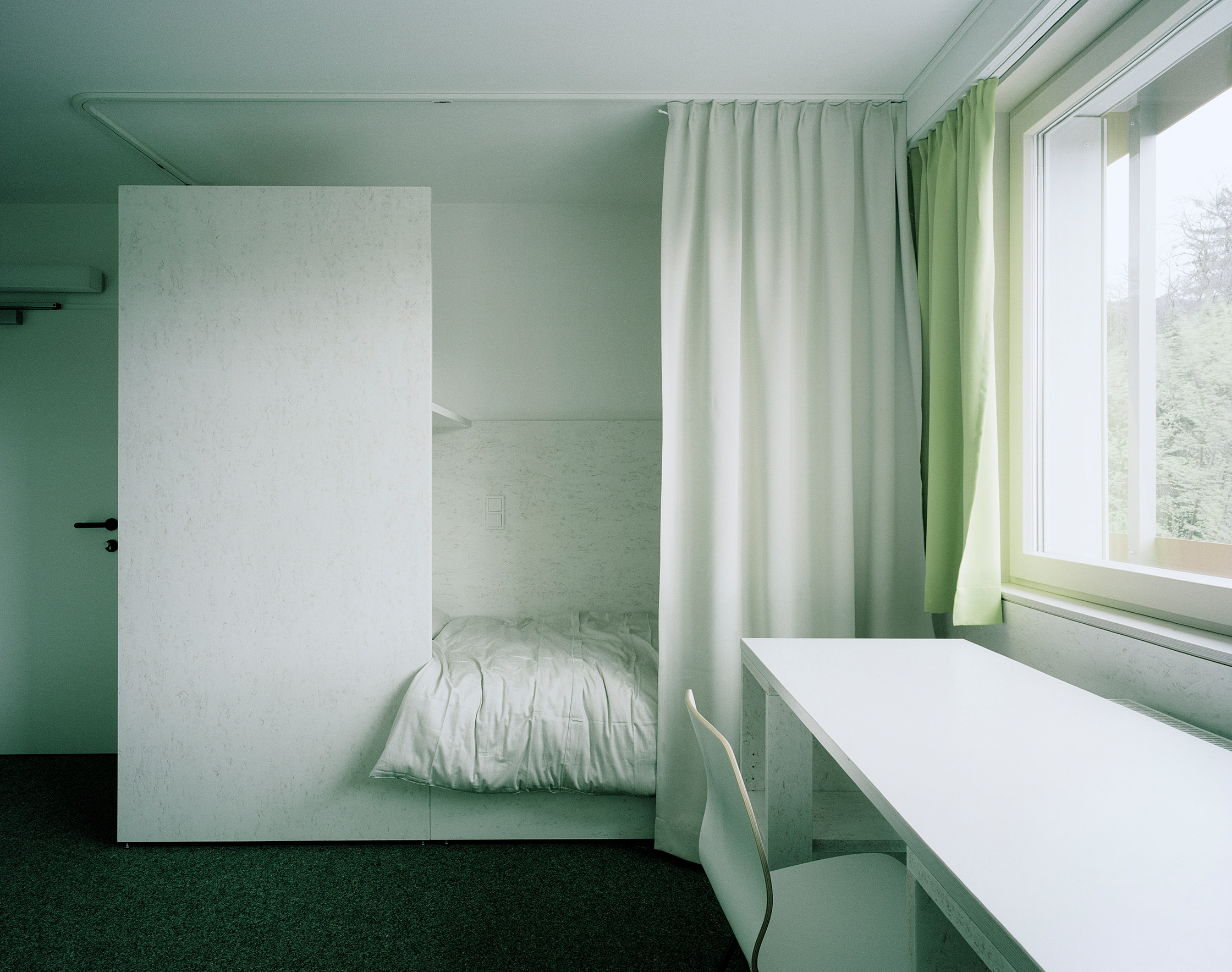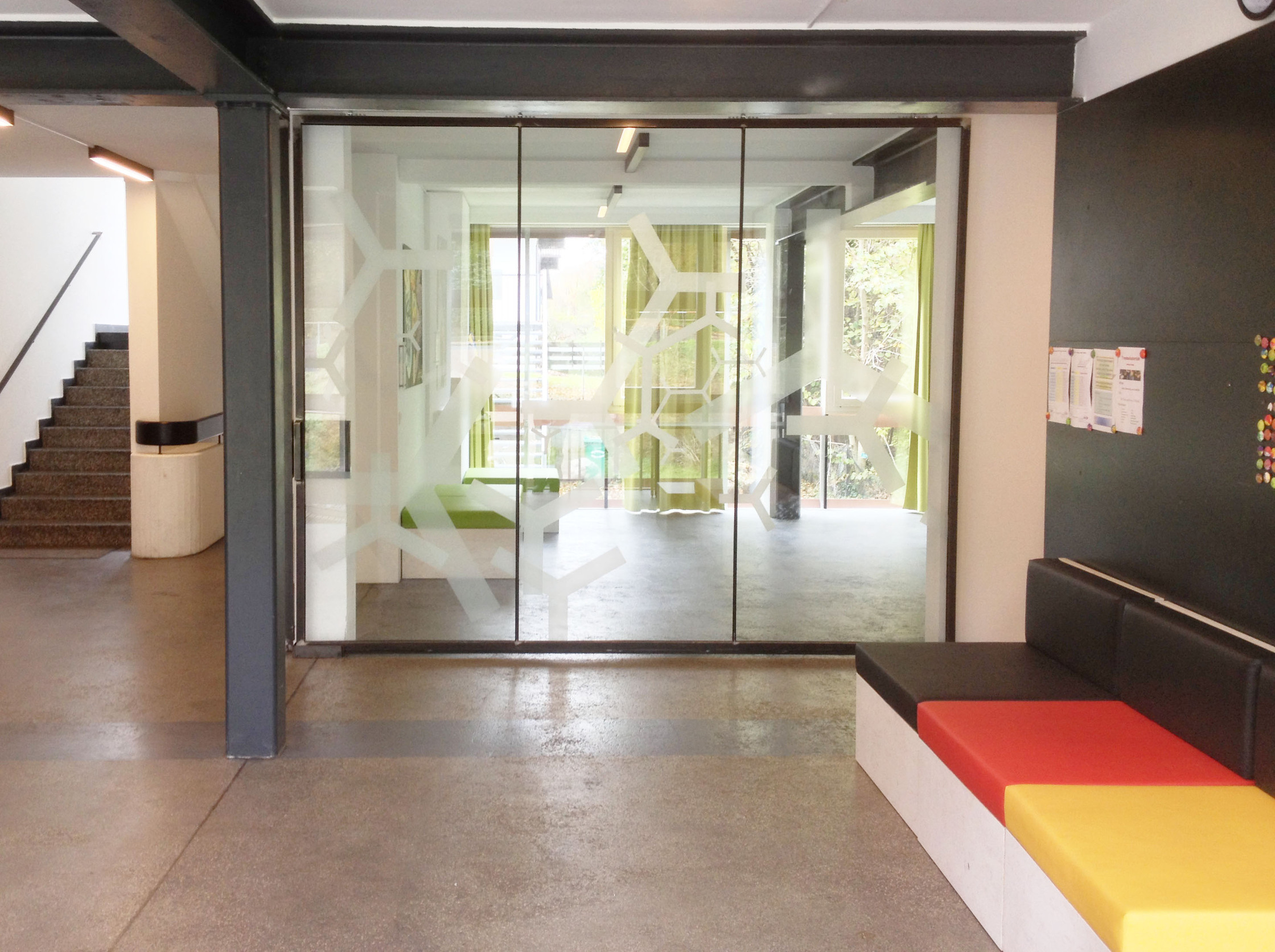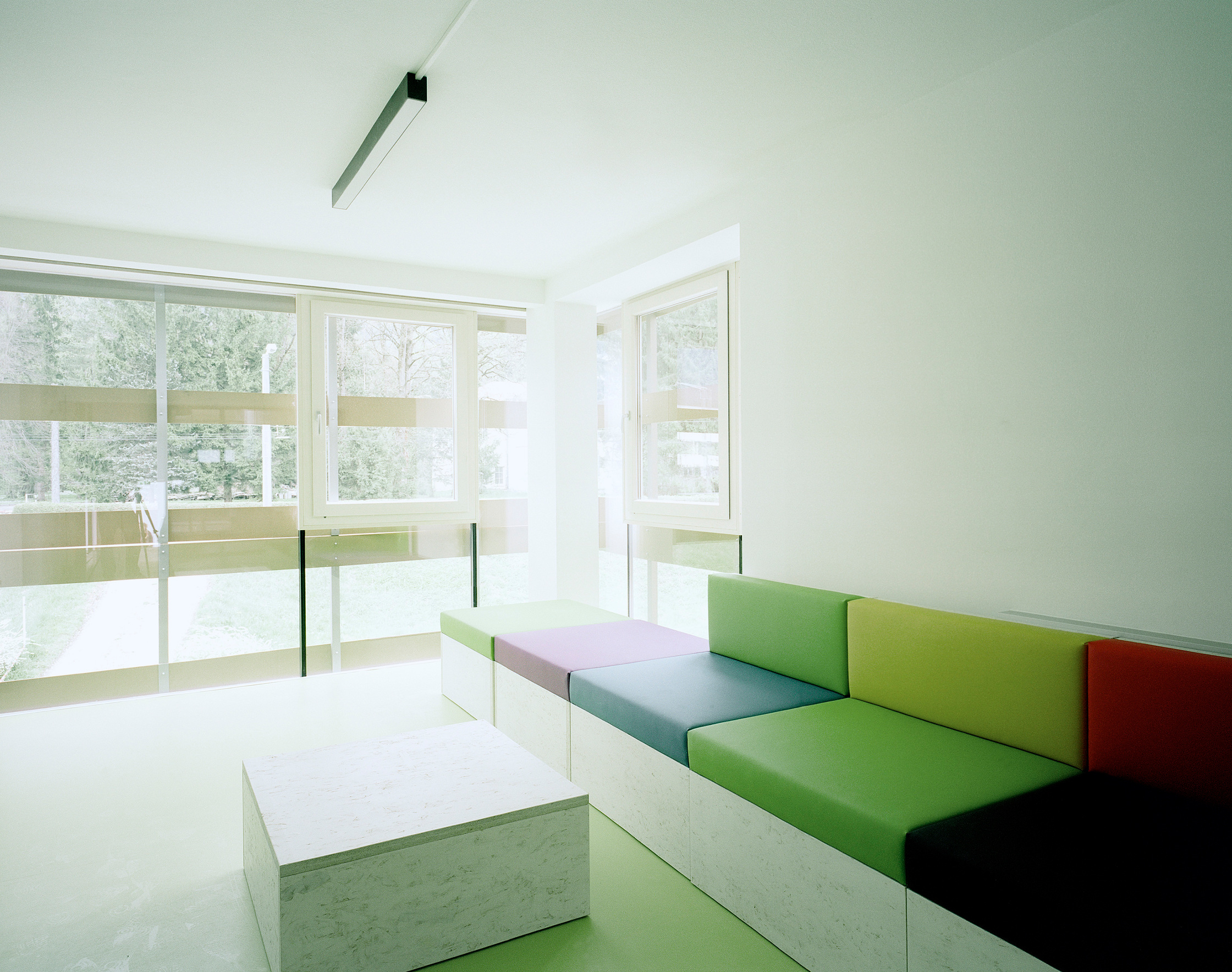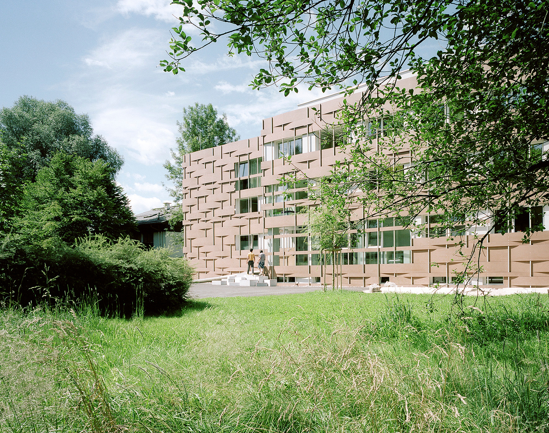 Neue Fassade aus Holzfertigelementen mit vorgehängter Recyclefähiger Steinwolleplatte; Dachaufbau aus Holzelementen; Wiederverwenung der alten Fassadenverkleidung aus Waschbetonplatten in den Aussenanlagen als Sitzbänke und Terrassenbelag.