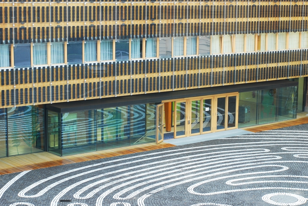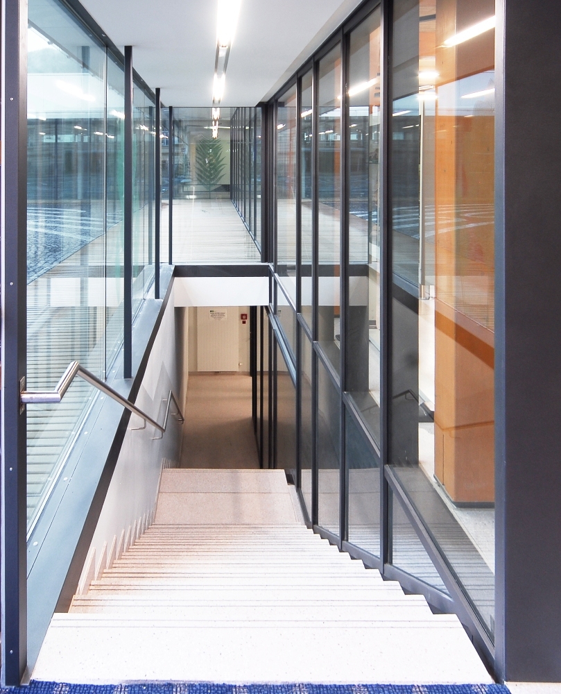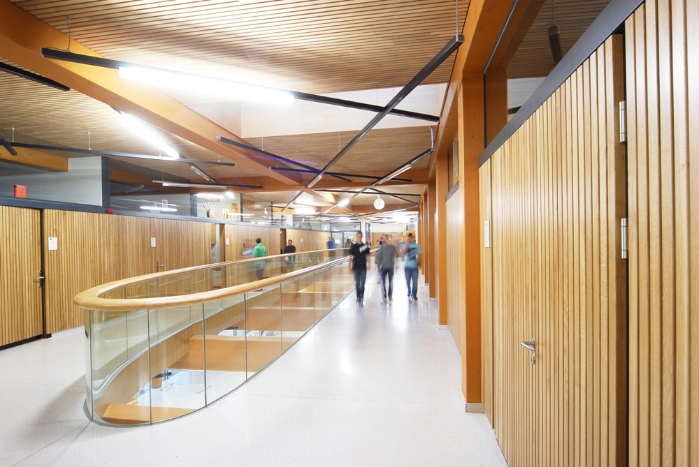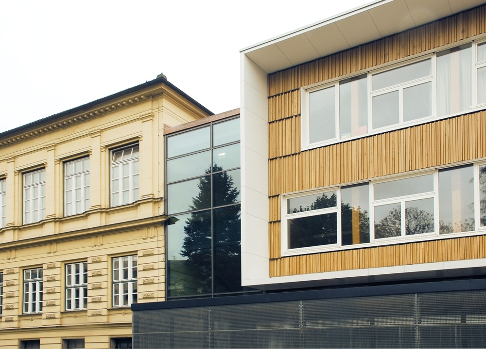 Zum ProduktDer Zubau zur Schule ist in Holz + Stahlbeton, die Aufstockung des Internats ist in Holz + Stahl ausgeführt.