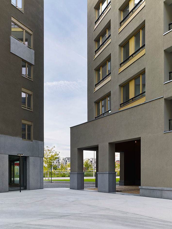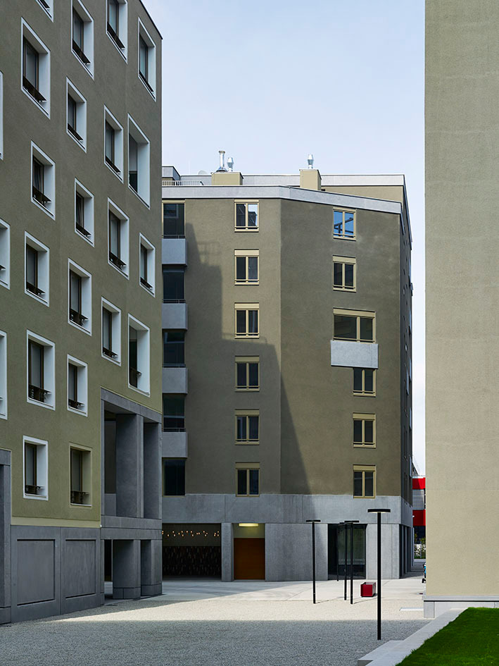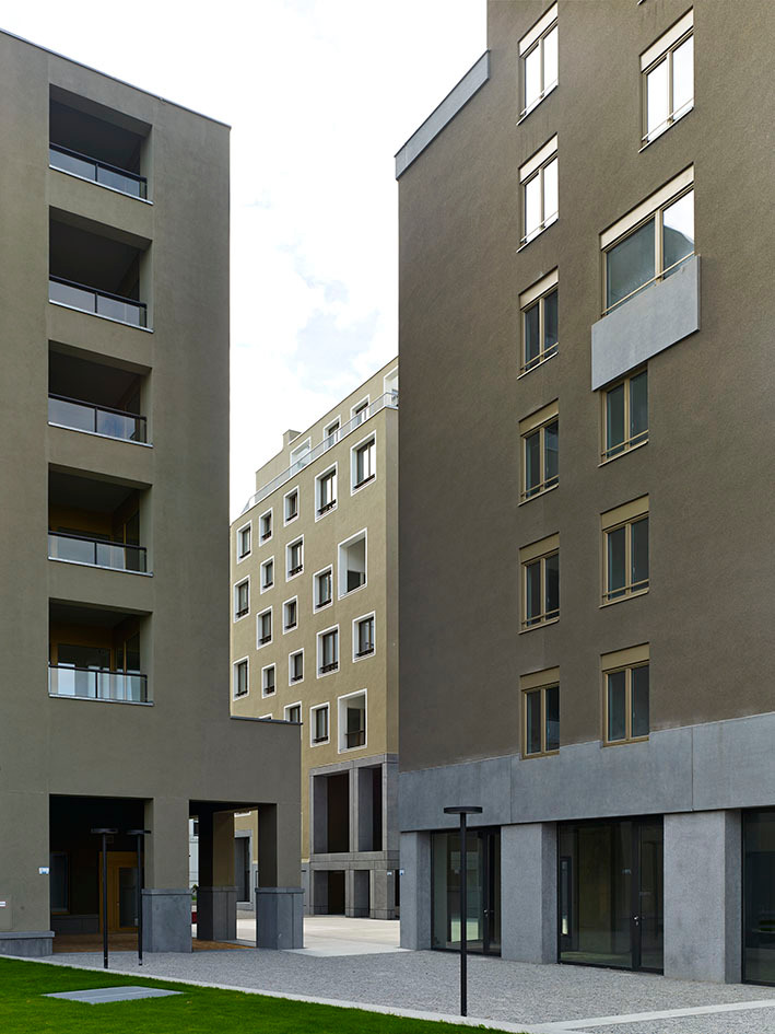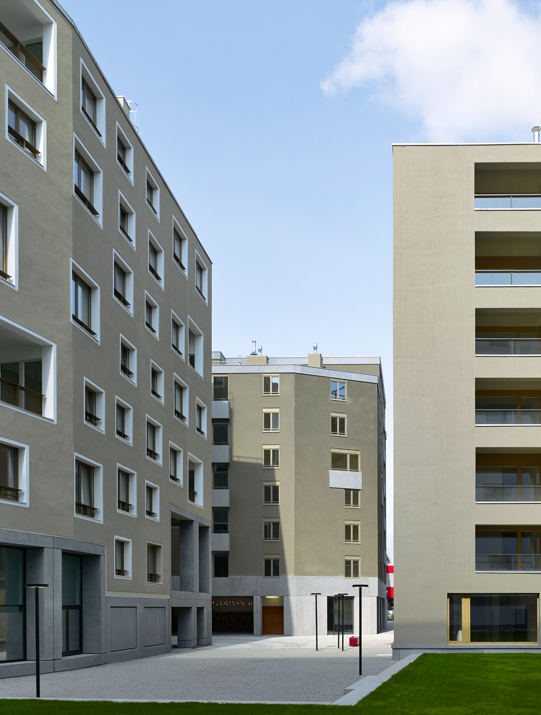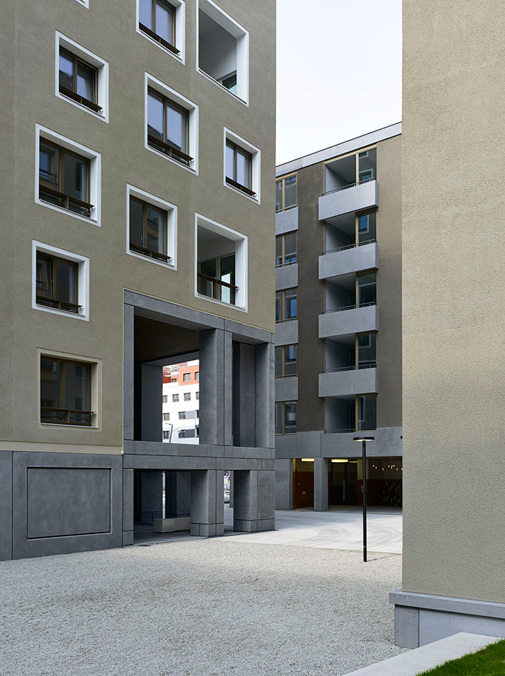 Neuwirth überzeugte den Bauträger, für die Bebauung des Grundstücks nicht nur ihn, sondern noch zwei weitere Architekturbüros aus anderen Ländern zu engagieren. Und so konnte er schließlich gemeinsam mit von Ballmoos Krucker Architekten aus Zürich und Sergison Bates architects aus London ein heterogenes Gebäudeensemble mit insgesamt 90 sehr unterschiedlich gestalteten Wohnungen entstehen lassen. Die nationalen Handschriften aus Österreich, der Schweiz und Großbritannien sind dabei unverkennbar.