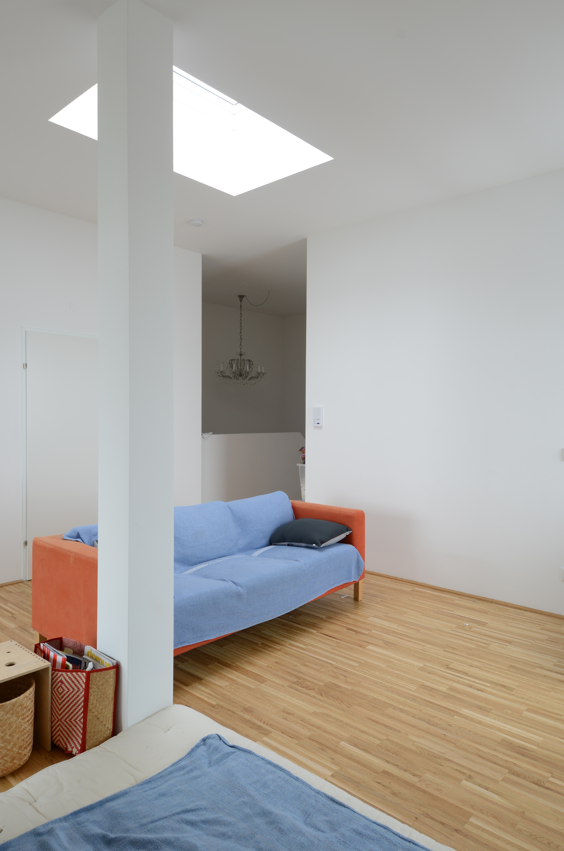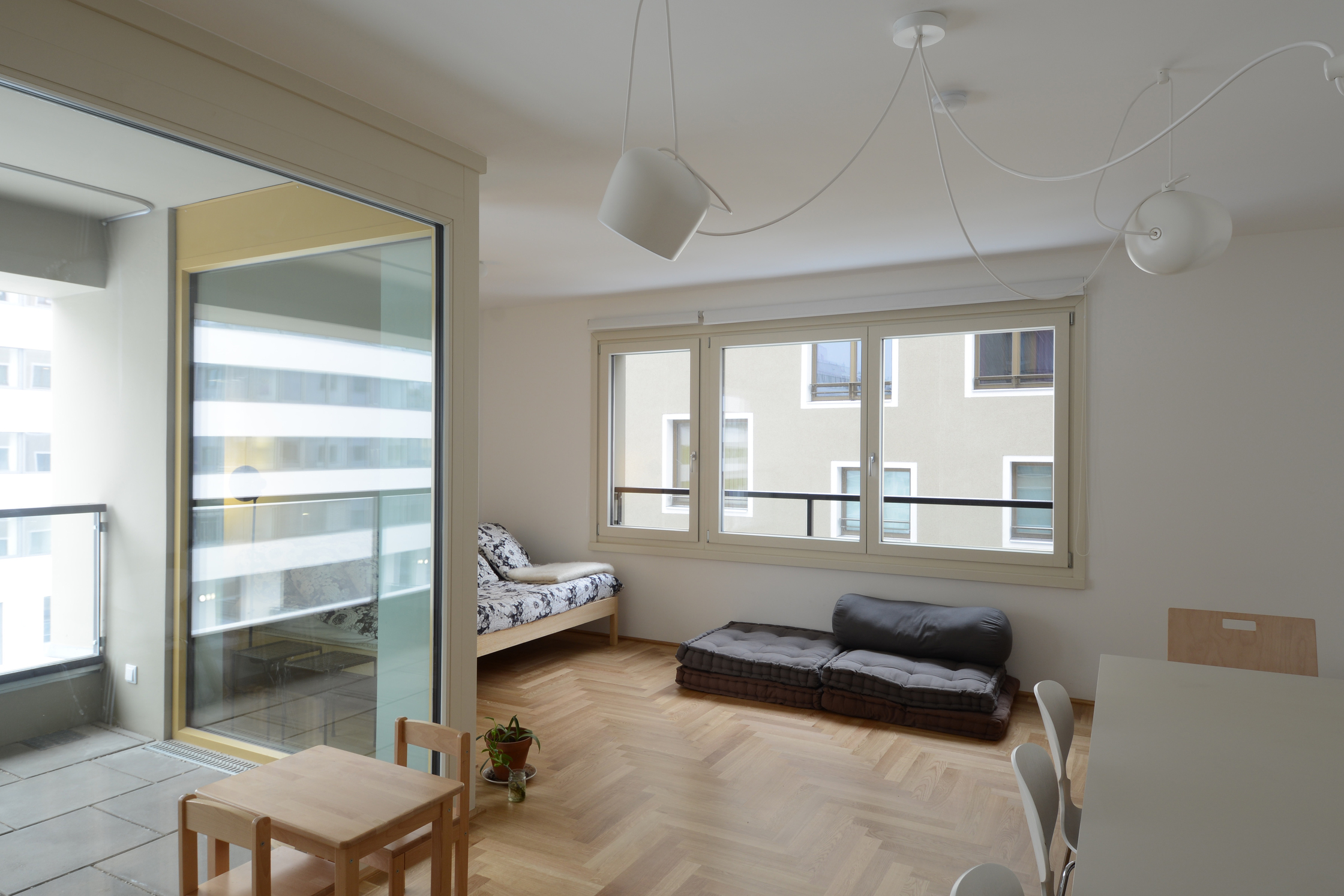 Als wären die ungewöhnliche Putzfassade und die vielfältigen Wohnungszuschnitte nicht schon genug des Überdurchschnittlichen, verfügen die drei Niedrigenergiehäuser über Fußbodenheizung und Dreischeiben-Verglasung. Das ist ein beinahe schon luxuriöses Gesamtpaket. Ob der hohe Aufwand und die entsprechend hohen Kosten in Relation zu der Idee des geförderten und zu bezahlenden Wohnens stehen, ist für Werner Neuwirth nicht die Frage, da es bei den Baukosten gelang, innerhalb des förderbaren Budgetrahmens zu bleiben.