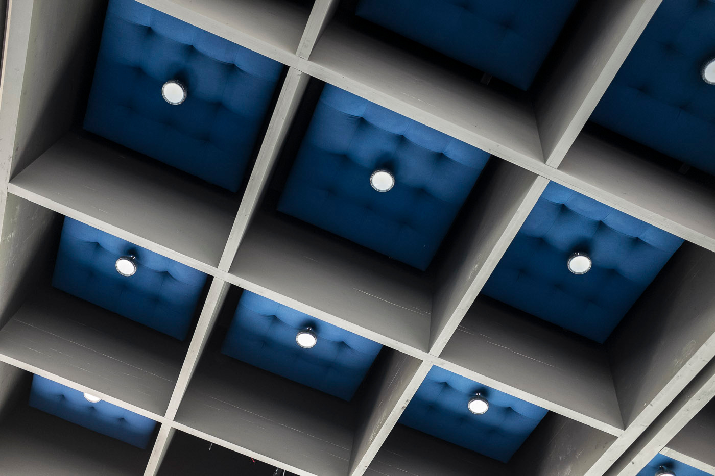 Das Dach wurde aus Holzträgern gefertigt, die im quadratischen Raster angeordnet sind und auf hölzernen, ganz leicht gekrümmten Pendelstützen und auf drei Betonkernen ruhen.