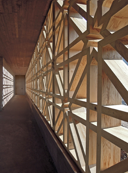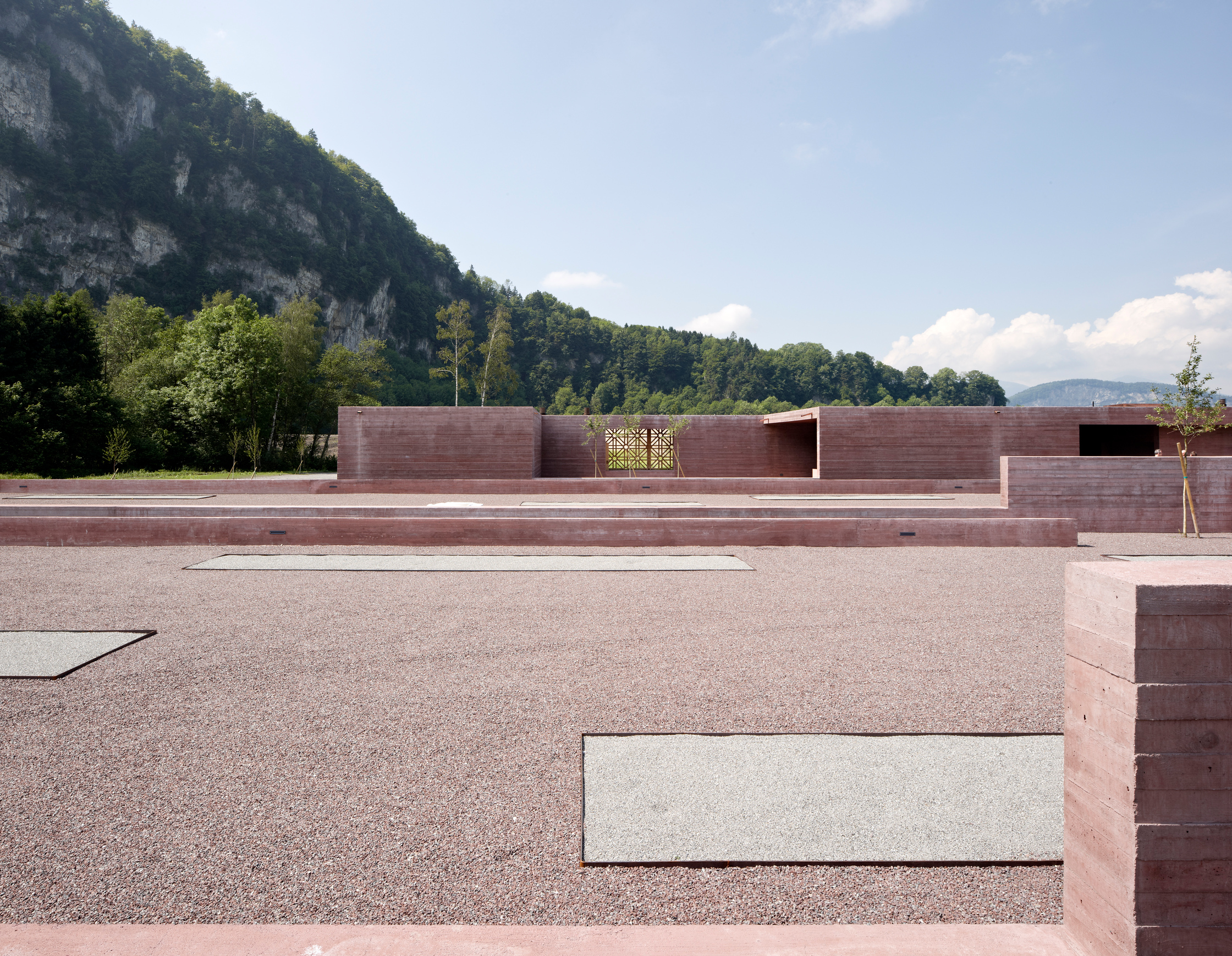 Mit den rot eingefärbten Mauerschichten integriert sich der Friedhof schlicht in die Landschaft.