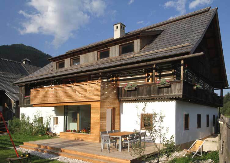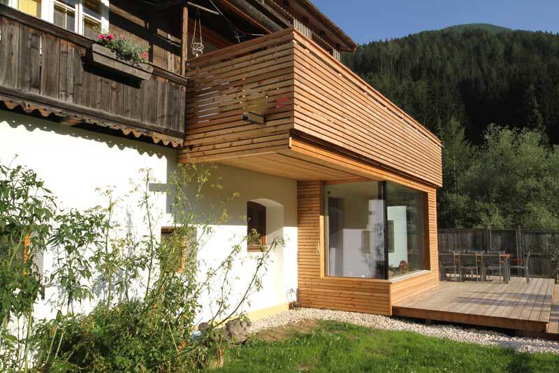 Ansicht Bauernhaus_Westseite: Zubau aus Lärche bietet Erweiterung der Wohnfläche im Erdgeschoß, Ausgang zur Terrasse und im Obergeschoss eine Balkonvergrößerung.