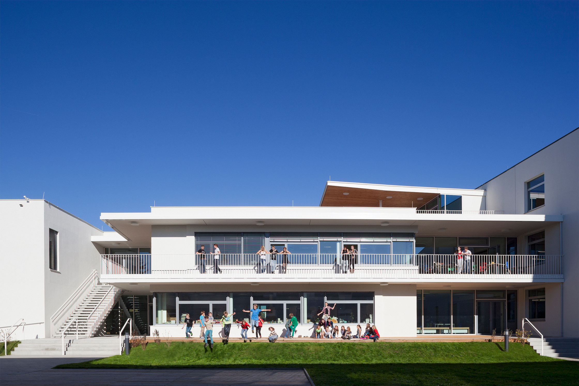 Siegerin Gabu Heindl hat dies befolgt, indem sie den offenen Kreuzgrundriss der Schule weiterführt und es vermeidet, formal in Konkurrenz zu treten. Keineswegs geschont hat sie sich allerdings selbst in der Ambition, ein möglichst modernes, für neue pädagogische Konzepte taugliches Raumgefüge anzubieten. In einem zweigeschoßigen und damit gegenüber dem Bestand niedrigeren Baukörper ordnete sie die geforderten Klassenräume an. Leicht aus der rechtwinkeligen Ordnung des Bestandes gedreht, bildet der neue Trakt mit den bestehenden Flügeln einen zur Umgebung wie zur Sonne geöffneten Hof und bricht zudem die Linearität der langen Gänge. Terrassen auf allen Ebenen und Holzflächen, die in der Art von Tanzböden in die Gartenfläche eingelassen sind, machen ihn zum vielfältig nutzbaren Lern- und Aufführungsort im Freien.