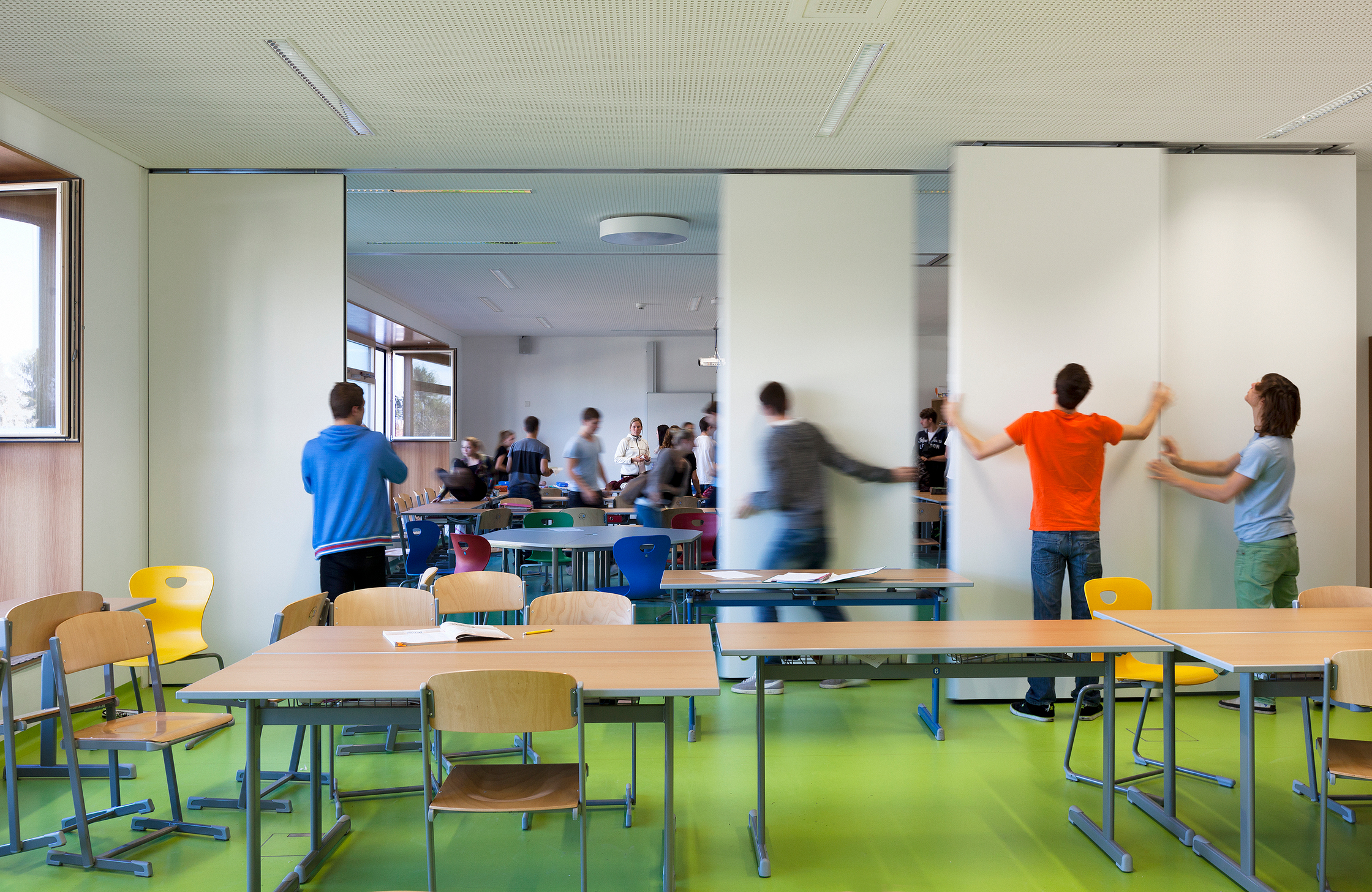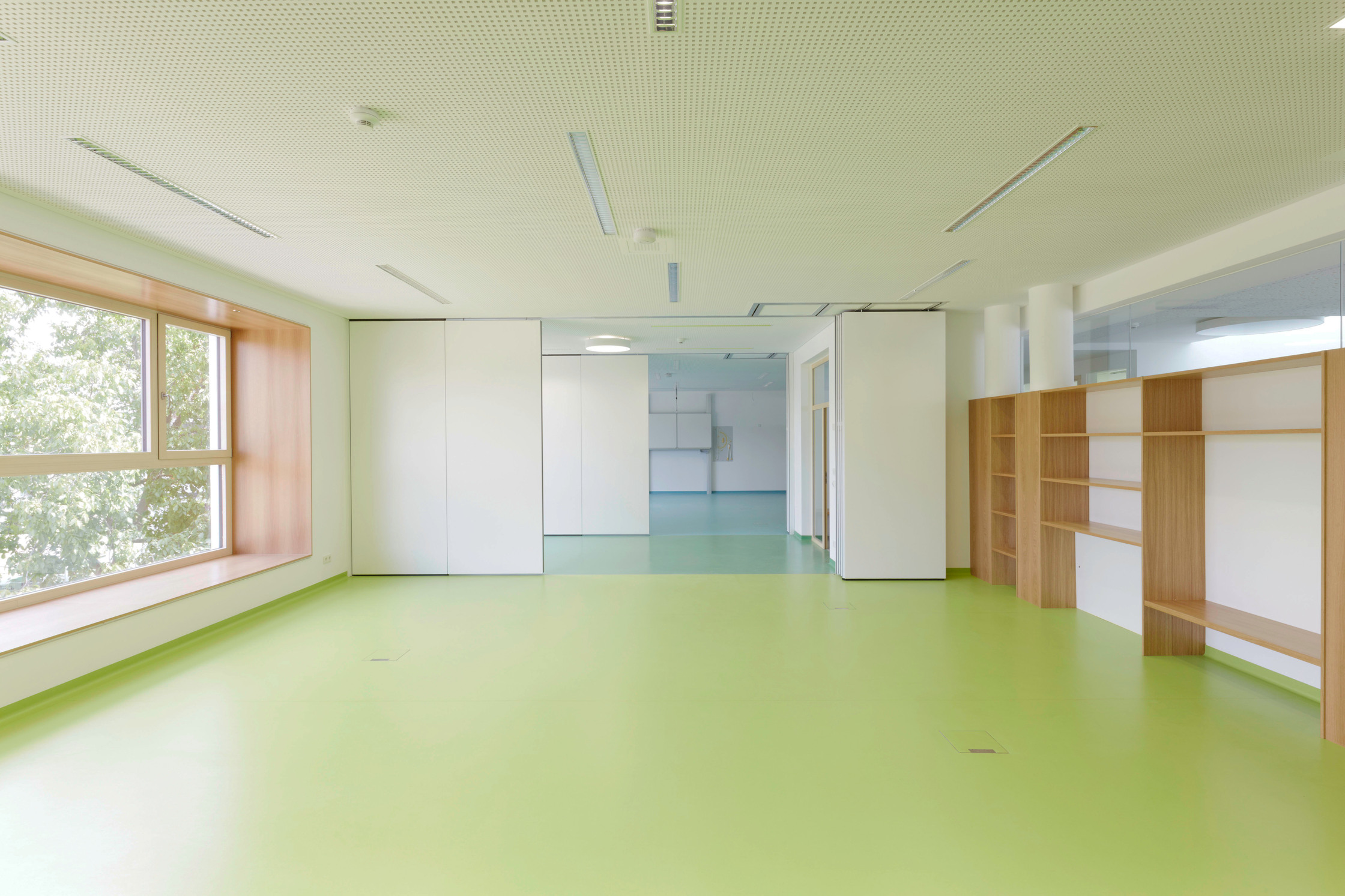 Jeweils zwei Klassen können mit dem dazwischenliegenden Modulraum, einem kleineren Arbeits- oder Besprechungsraum, dank mobiler Trennwände zu größeren Raumgefügen verbunden werden. Bis zu 160 Quadratmeter große Räume können somit entstehen, was die Möglichkeiten innerhalb der Schule ohne zusätzlichen Raumverbrauch enorm erhöht. Breite, tiefe Fenster bieten nicht nur Aussicht, sondern sind zugleich gern genutzte Sitznischen.