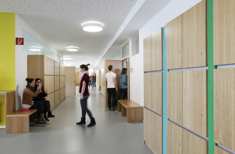 Das alles war im Anforderungsprofil nicht vorgesehen. Möglich wurde es sowohl dank eines effizient und wirtschaftlich umgesetzten Raumprogramms als auch in Folge eines intensiven Dialoges, den die Architektin auf eigene Initiative in Form von Workshops mit hundert Lehrern und den Schülerinnen und Schülern führte, um die Bedürfnisse auszuloten und das Wettbewerbskonzept dahin gehend zu schärfen.