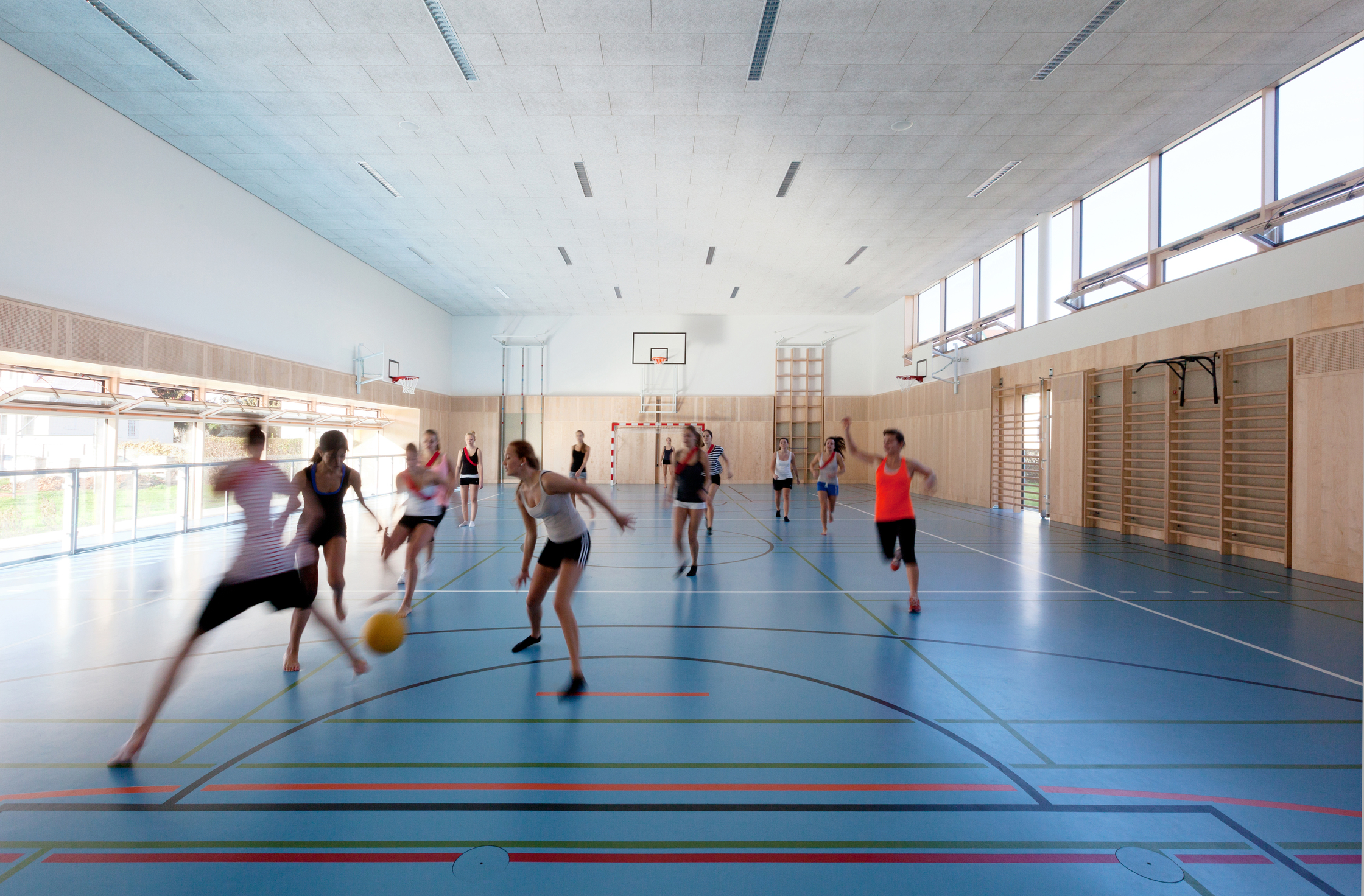 Er ist einer von fünf Schulhöfen, auf denen sich die über 900 Schülerinnen und Schüler gut für die diversen Aktivitäten verteilen lassen. Ein weiterer neuer Hof entstand zwischen altem und neuem Turnsaaltrakt. Hier wurde der Sportbelag der Freianlage weitergezogen und das Ganze mit einer Pergola überdacht. Auf dem Boden werden in Zukunft wetterfeste Koordinationsgeräte wie zum Beispiel Wippen ein von allen nutzbares Zusatzangebot bereitstehen. Etwas höher gelegen sollen Slacklines den Unterricht um Balancierübungen ergänzen, und ganz oben sind die schuleigenen Kletterer gefragt, die für den Projektunterricht die Pergola dank vorbereiteter Ösen zum Hochseilgarten verwandeln.