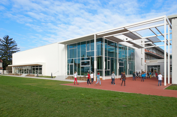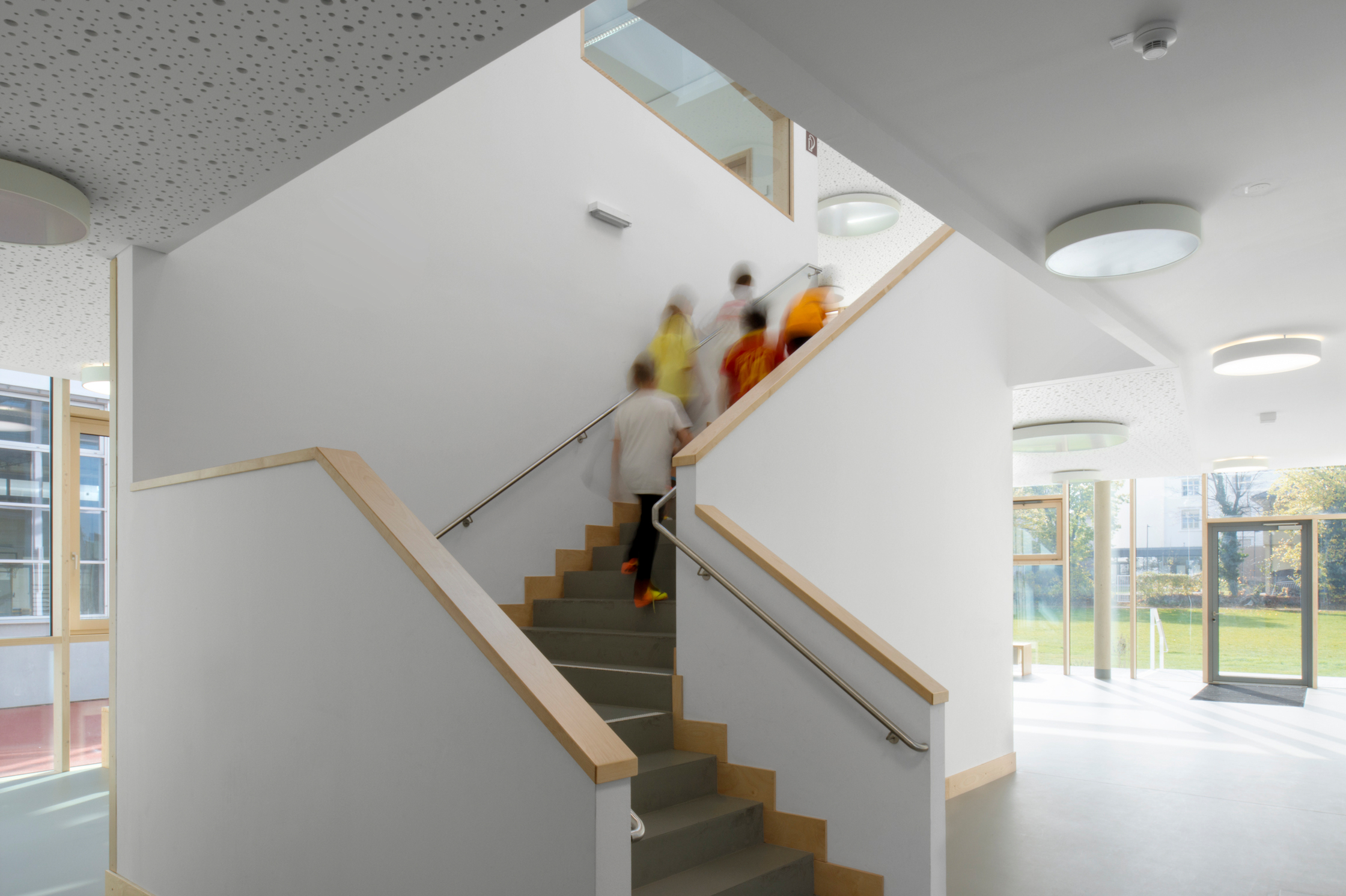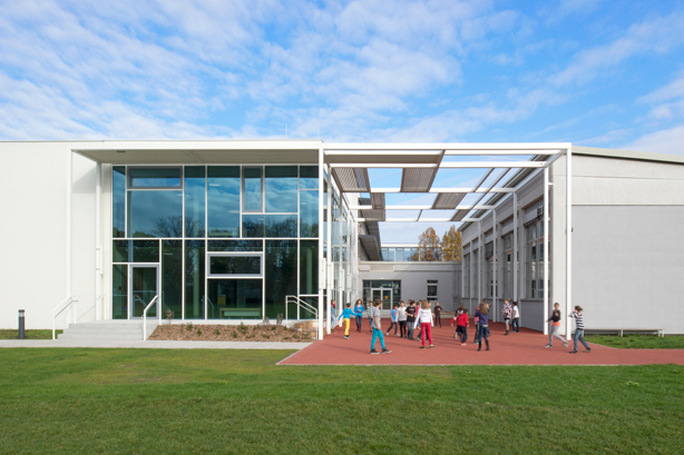 Wenn von wirtschaftlicher Umsetzung die Rede ist, heißt das nicht, dass das Innere nicht mehr bietet als entlang schmaler Gänge aufgefädelte Normklassenzimmer. Diese Art von Effizienz, wie sie in den meisten Schulen nach wie vor vorhanden ist, weist zwar der Bestandsbau auf, bei dem die Klassentrakte von den drei Aulen im Zentrum wegführen.